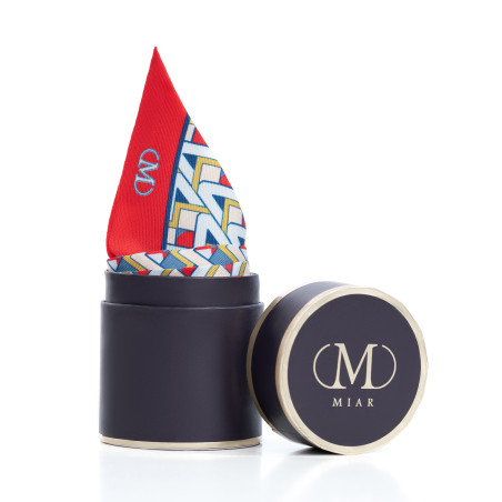 Add a touch of elegance to your outfit with the MIAR Silk Twilly Scarf. Crafted from premium silk, this Twilly showcases a striking geometric pattern in vibrant shades of blue, red, and black, perfect for injecting a splash of color into any ensemble.