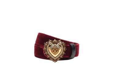Velvet Devotion belt featuring an exclusive bejeweled heart buckle with logo. Hand-tooled from a metal alloy and embellished with pearls, it has a vintage gold finish: