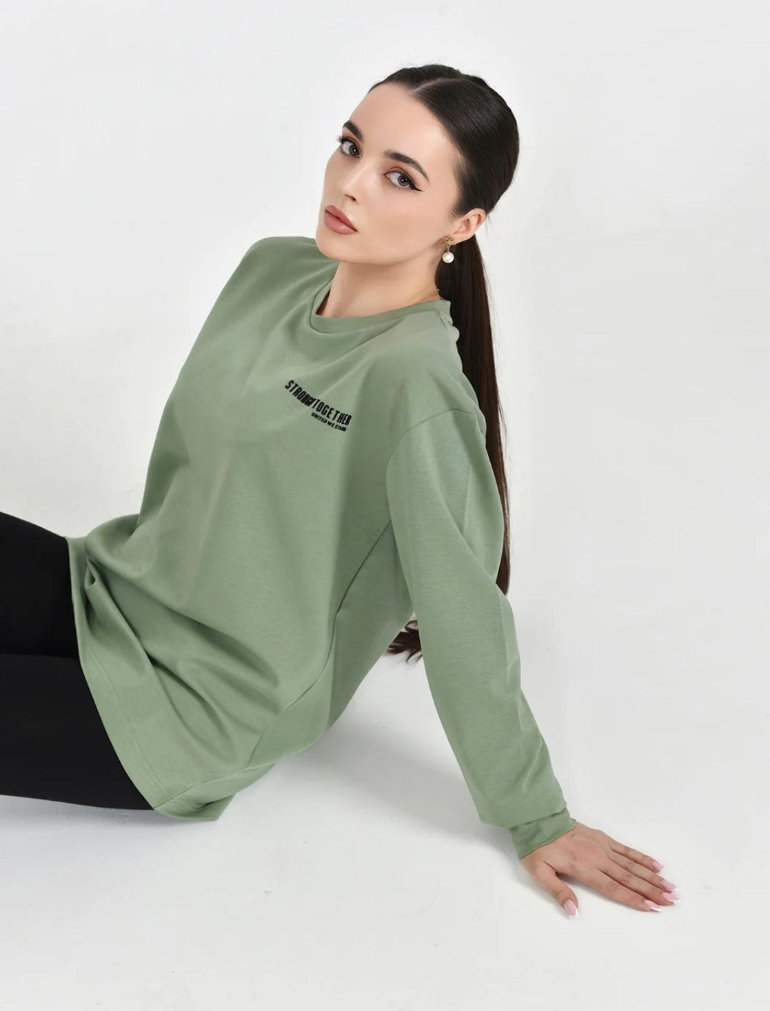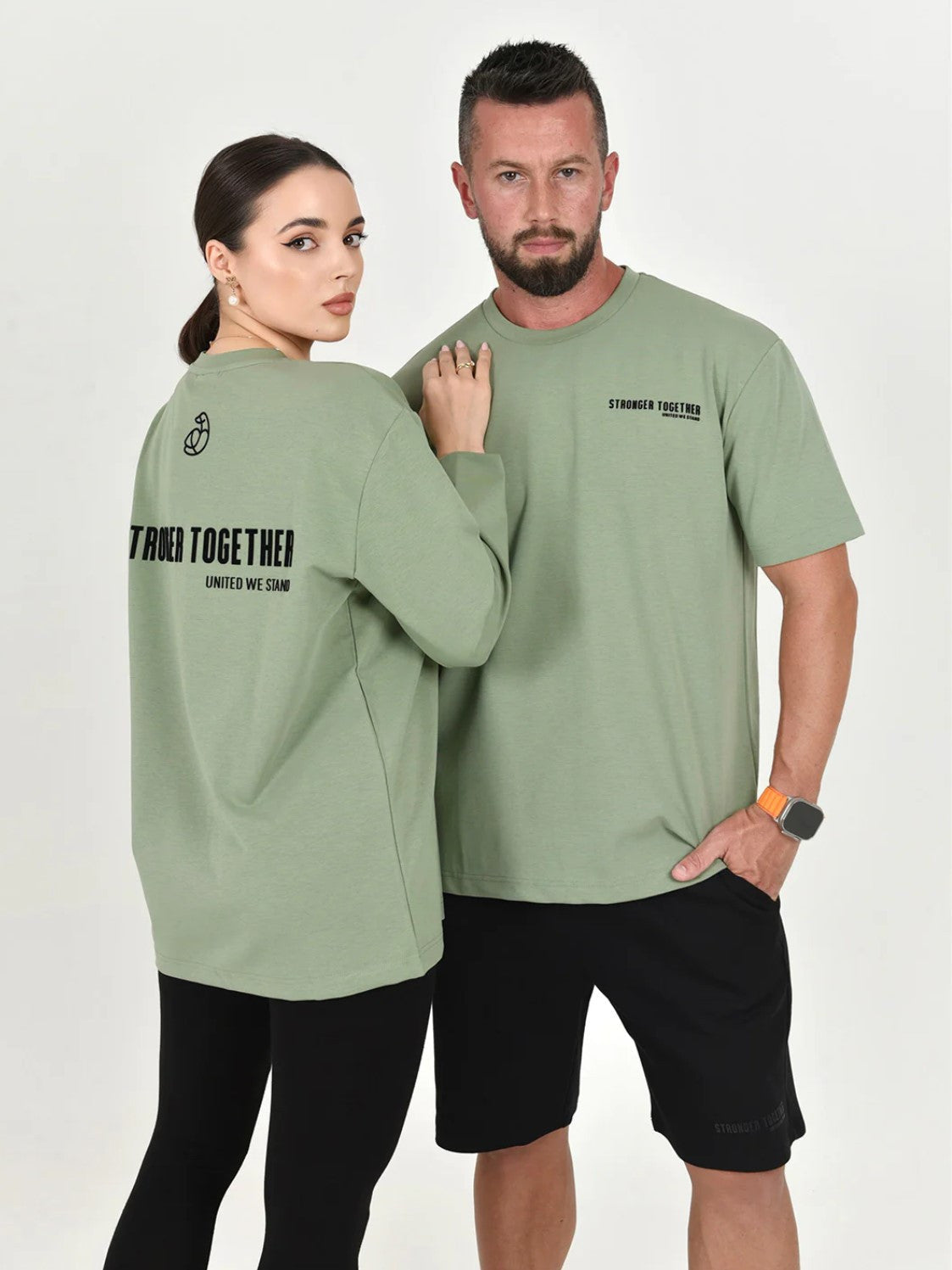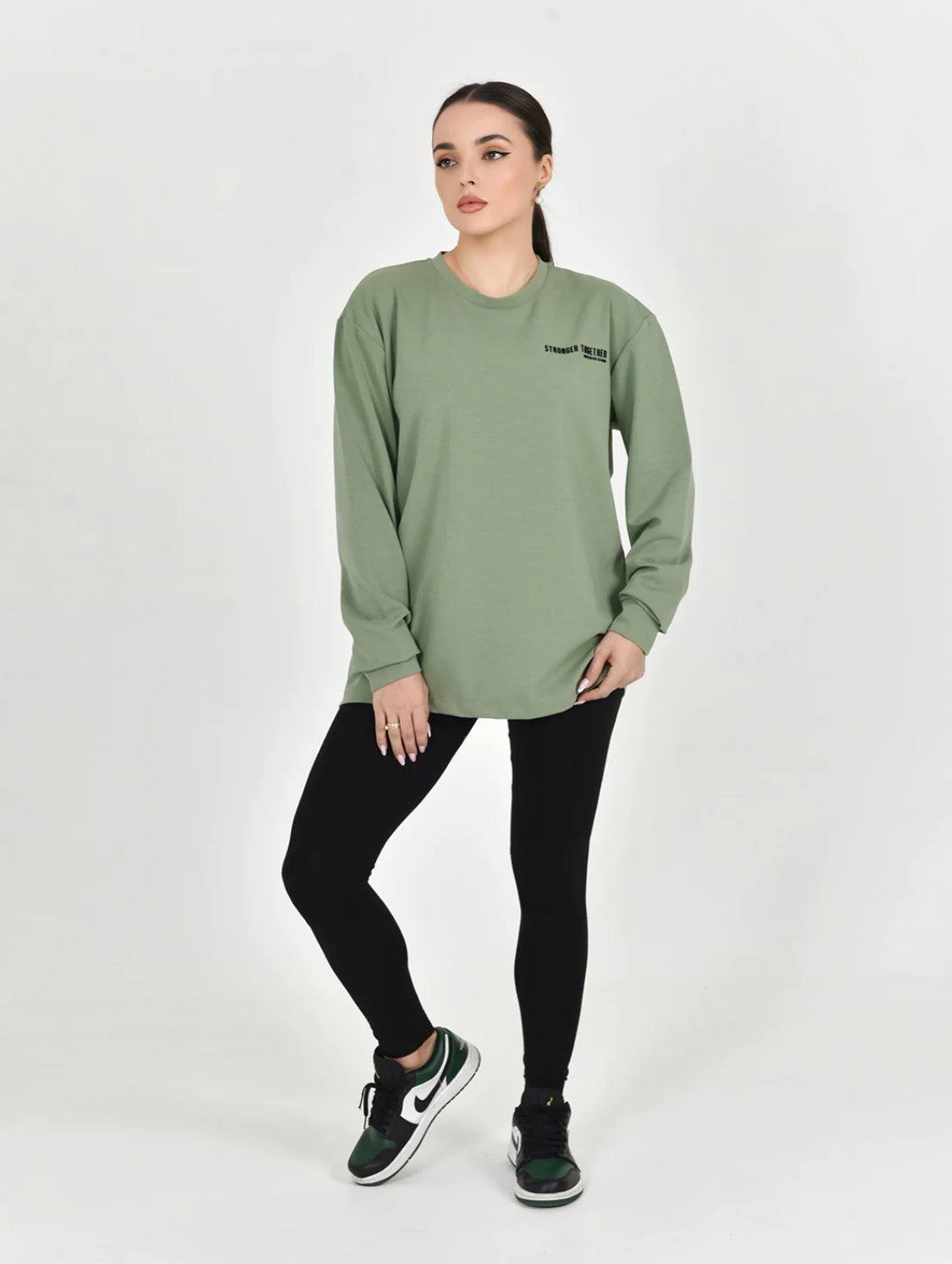 Olive Green long sleeves tshirt with Stronger Together united we stand message on the front and back side ..