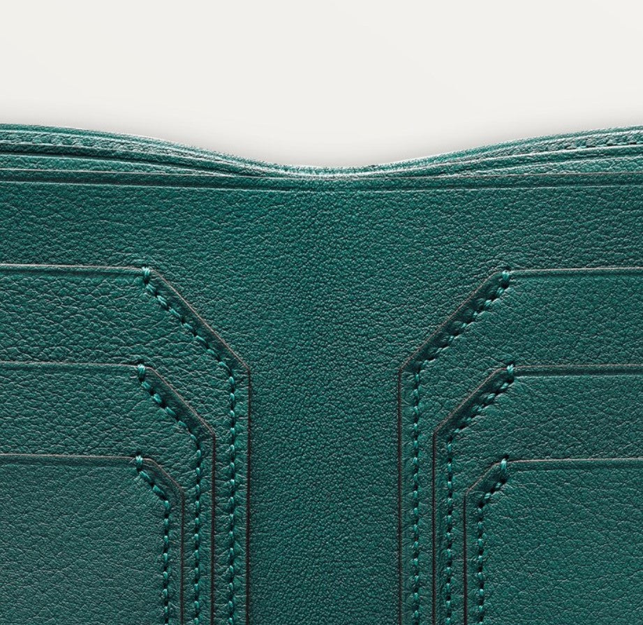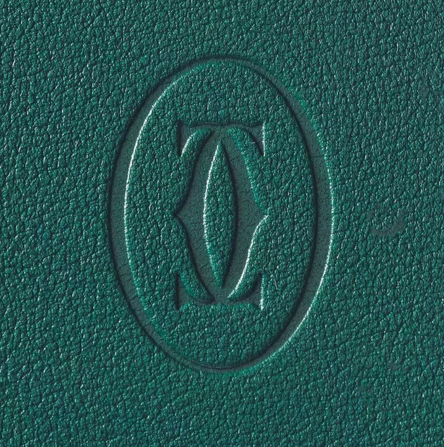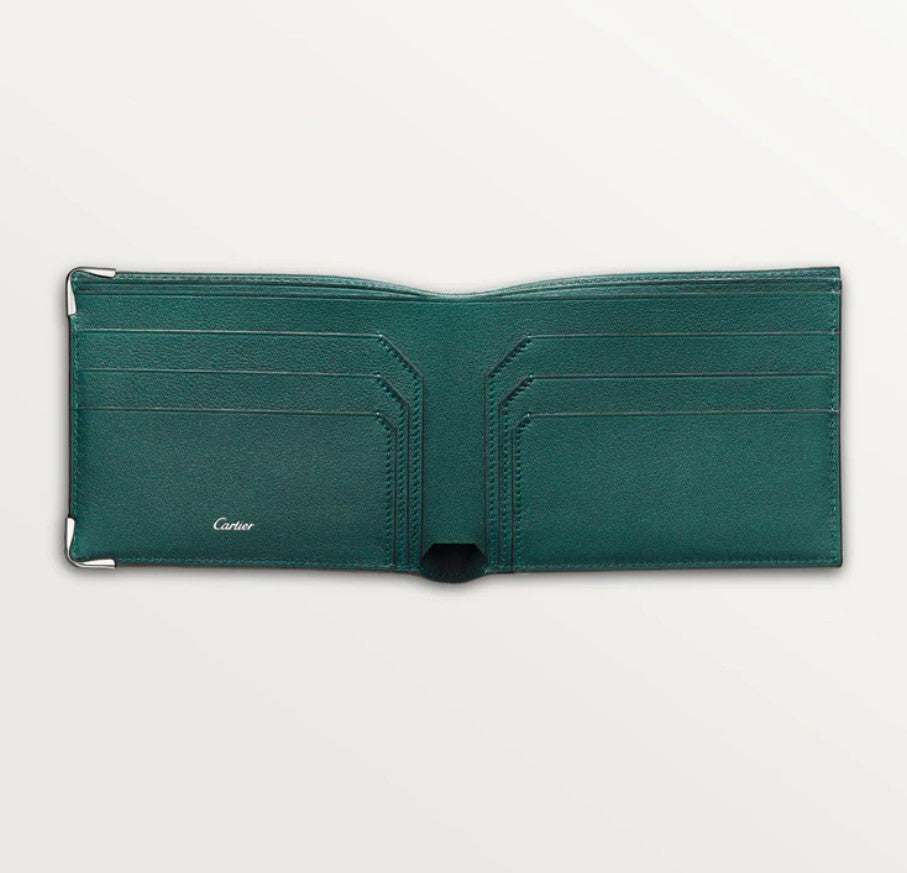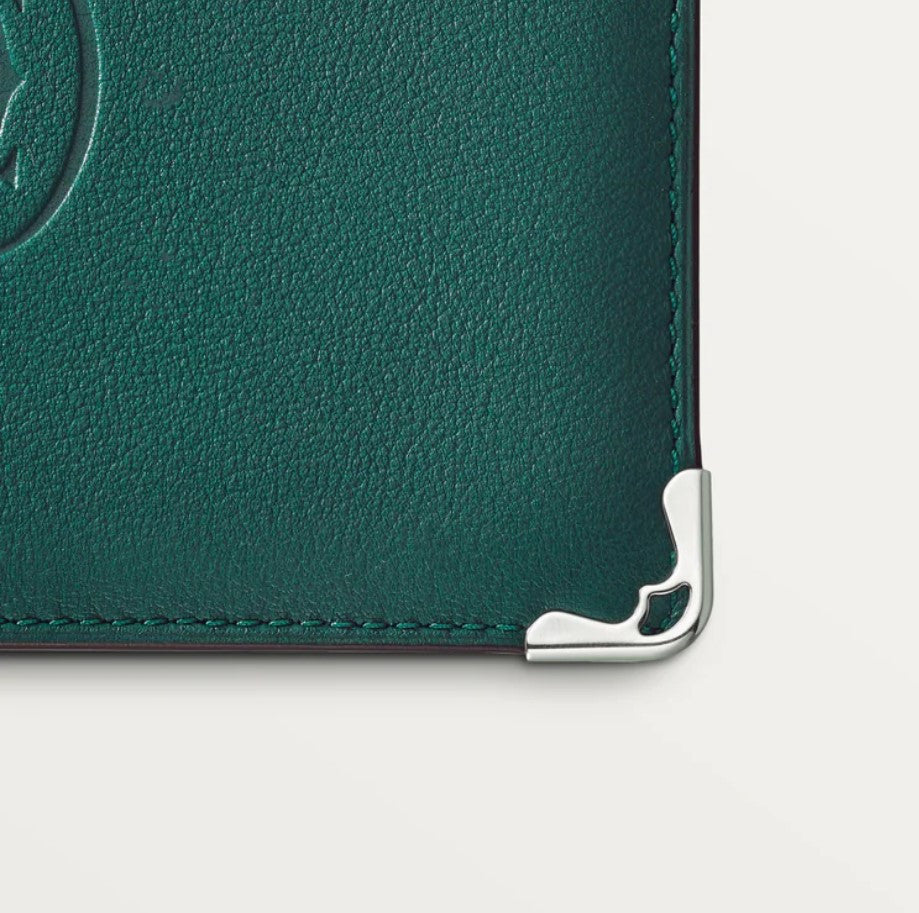 Peacock-green calfskin 6-credit card wallet. Exterior: embossed double C logo, stainless steel metal corners. Interior: peacock-green color calfskin, silver Cartier marking, six credit card slots, two banknote pockets.