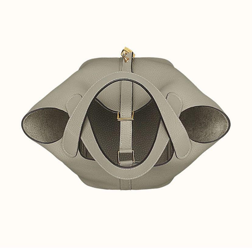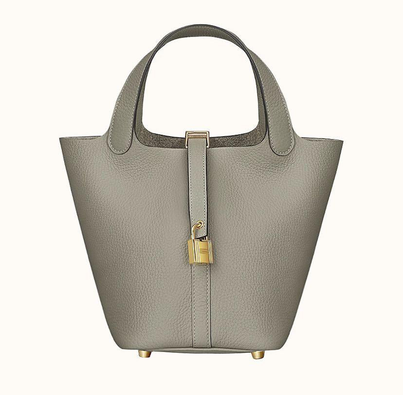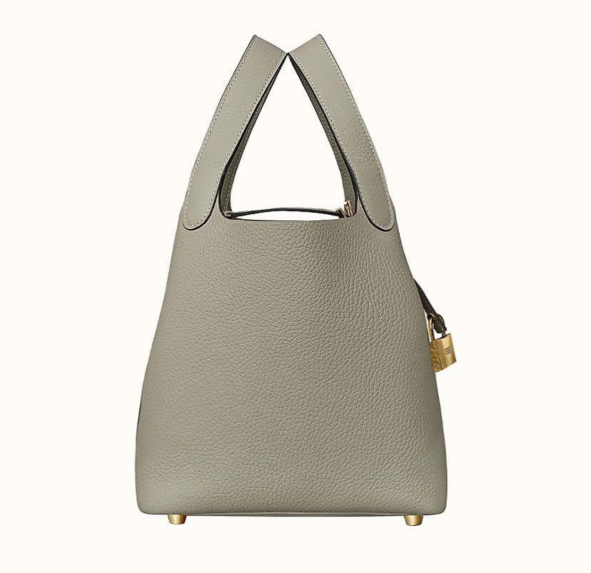 This is an authentic HERMES Taurillon Clemence Picotin Lock 18 PM in Sauge. This chic tote is crafted of soft taurillon clemence calfskin leather in light sage green. This unique tote is a one piece handbag with top handles that extend from the sides with an extra layer of leather for support. The top is open to a spacious matching suede interior. This is a fabulous tote for everyday use, from Hermes!