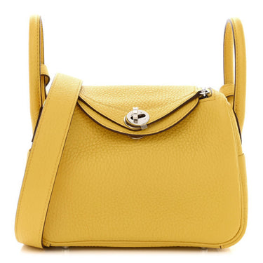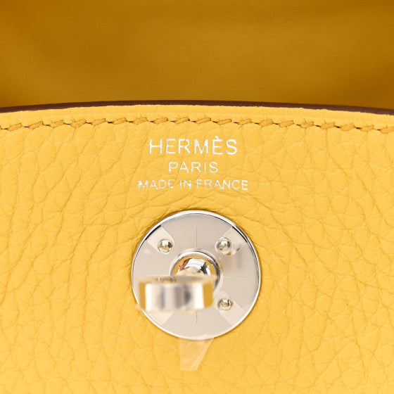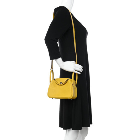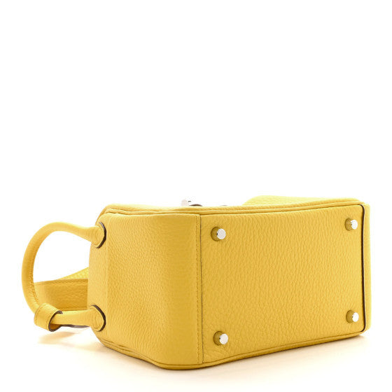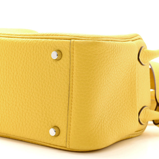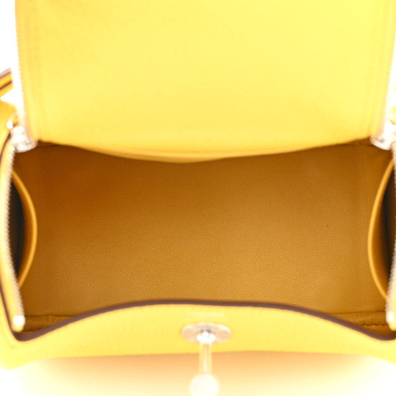 This is an authentic HERMES Taurillon Clemence Mini Lindy 20 in Sun. This mini shoulder bag is crafted of calfskin leather in yellow. The bag features rolled leather top handles, connected with a looping shoulder strap and silver hardware. The top zippers open to a matching leather interior with patch pockets.