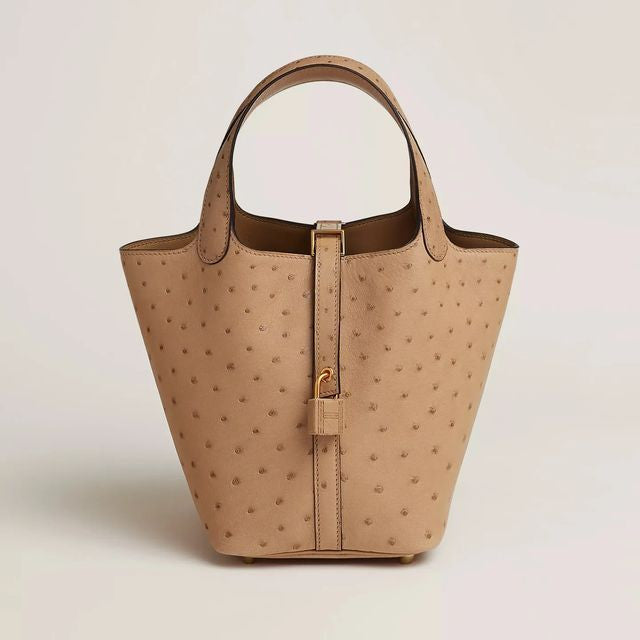 Ostrich skin is identifiable by its follicles, the points from which the feathers grow. In order to prevent them from lifting or getting damaged, Hermès flattens them and triples the skin. This is what gives this precious material its unique appearance.