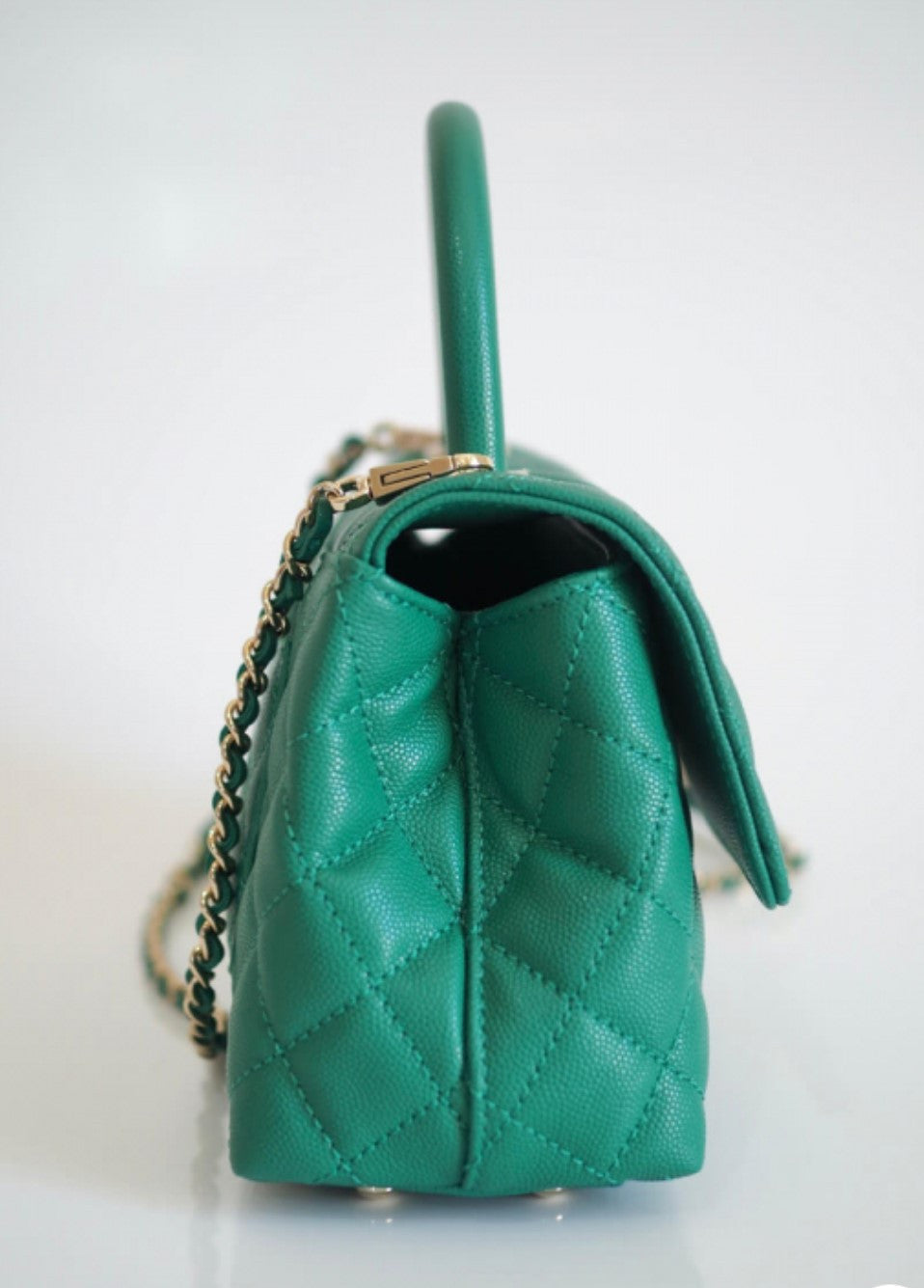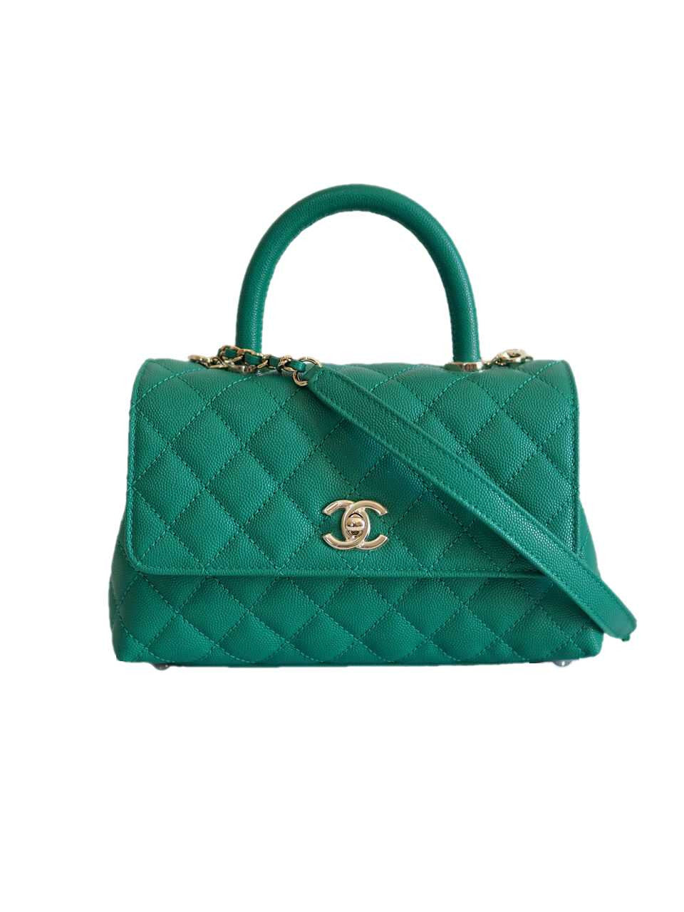 This highly sought after Chanel bag is from Metiers D’Art 2022 Collection. The bag is crafted in a durable diamond quilted caviar leather. It futures a light gold tone hardware, a signaturen CC turn lock, single rolled top handle and long detachable shoulder chain strap. This Chanel shoulder bag has a compact size, it can be carried on the shoulder or by hand. The front flap opens to a matching green leather interior lining with a three compartments, one zip pocket, extra wall pockets, series plate and brand logo.