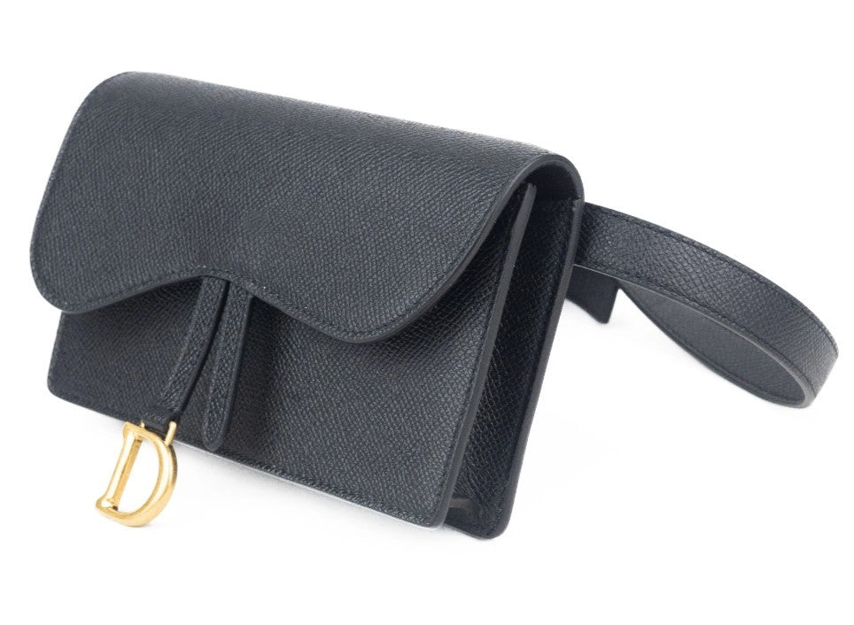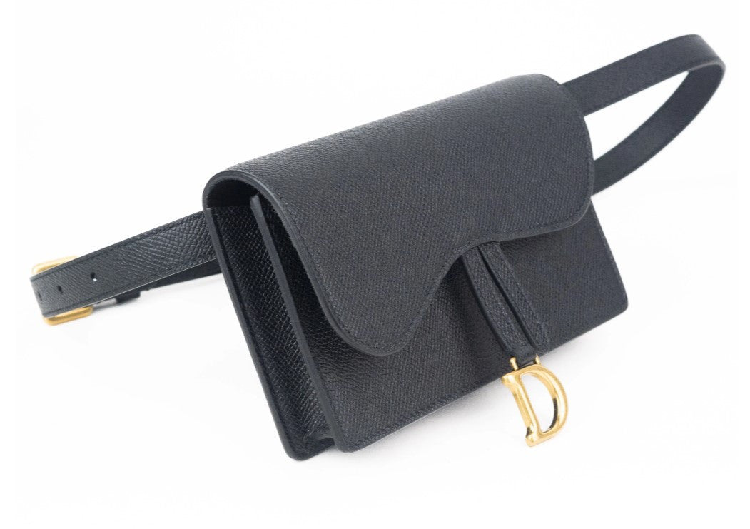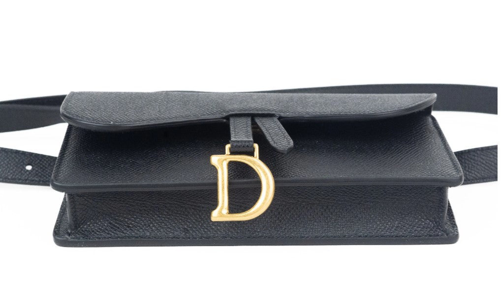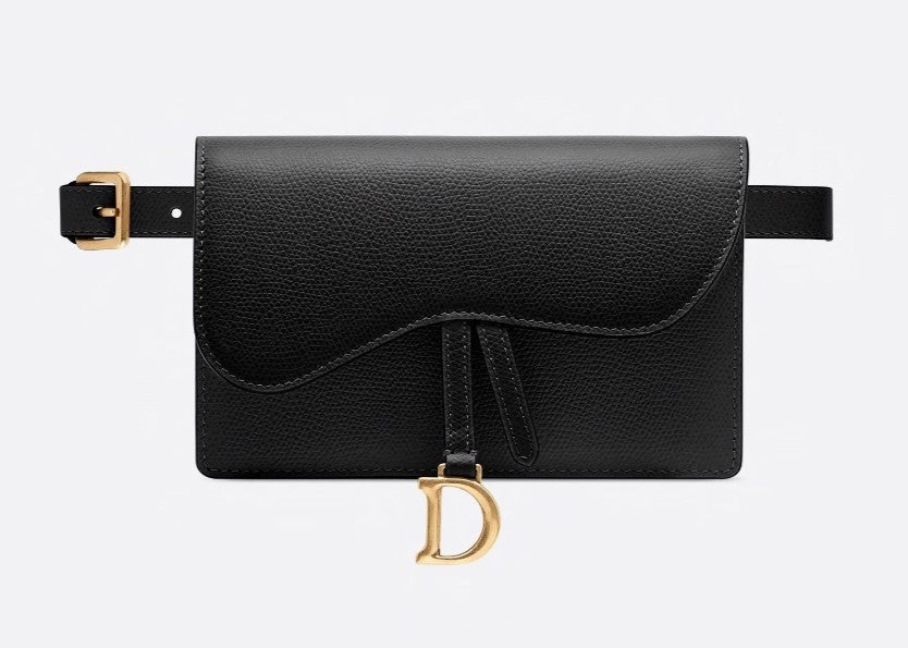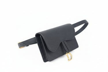 The Saddle wallet, crafted in black grained calfskin, is both modern and streamlined. The design has an asymmetrical flap with an antique gold-finish metal 'D' stirrup clasp. Featuring a detachable chain strap.