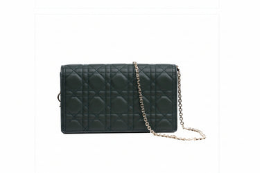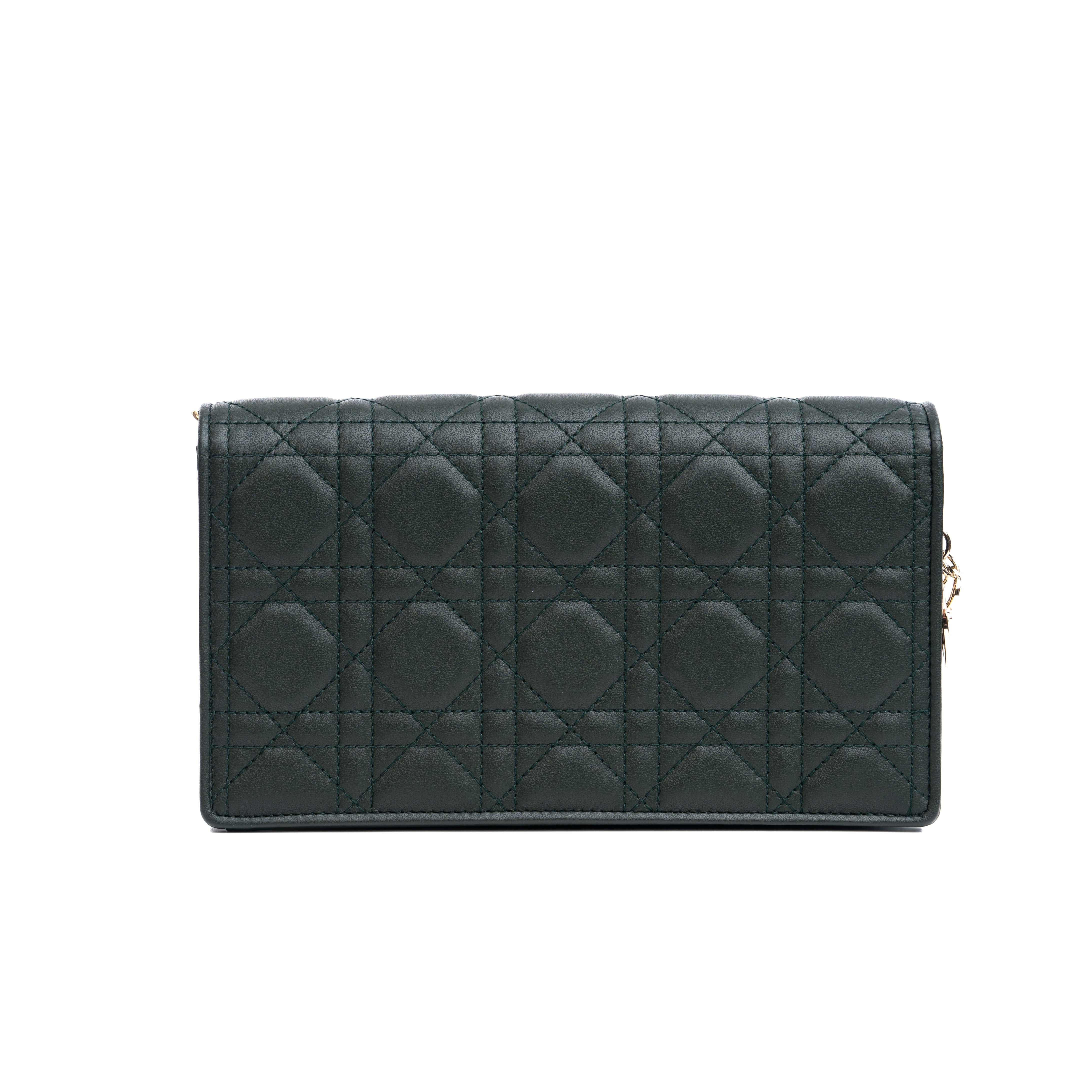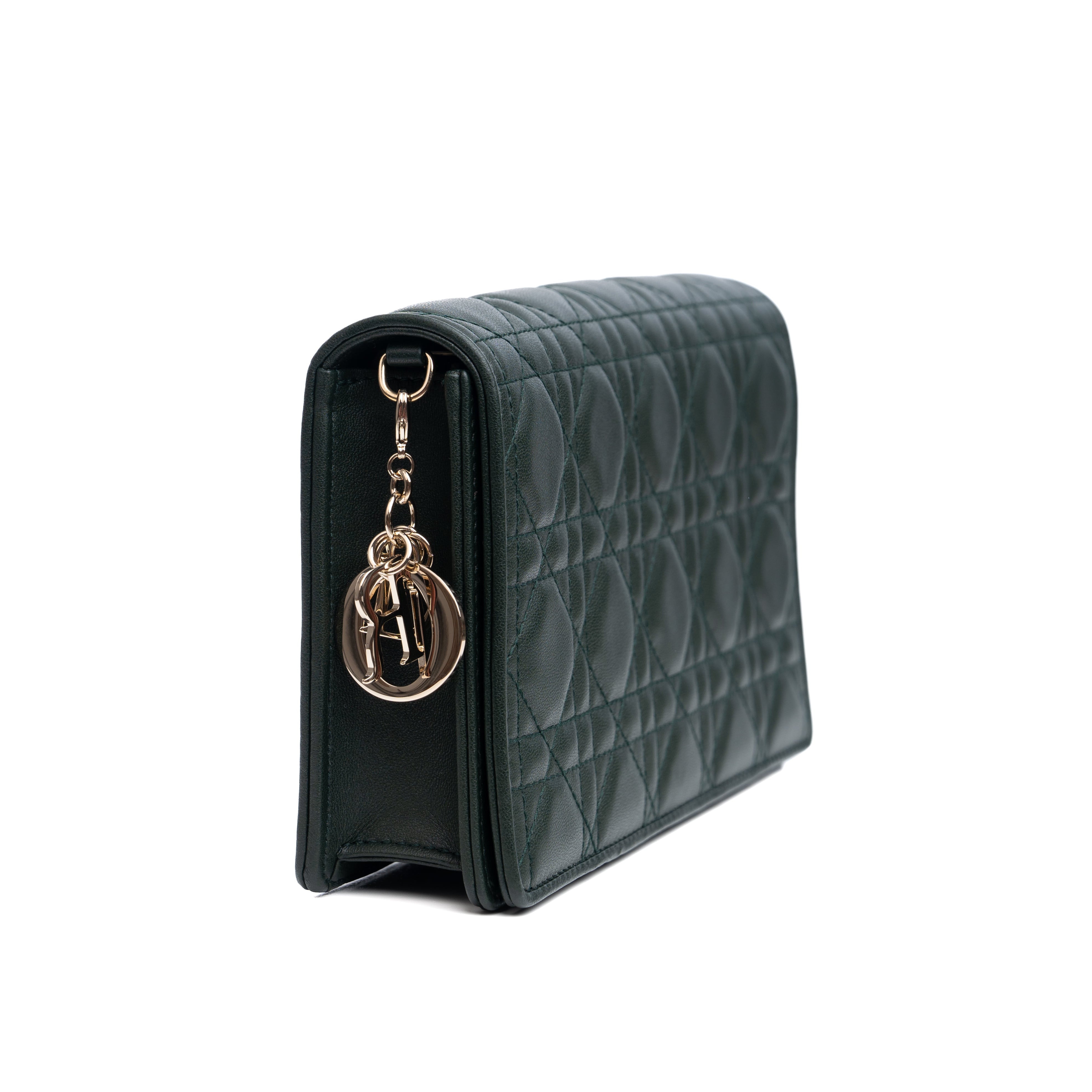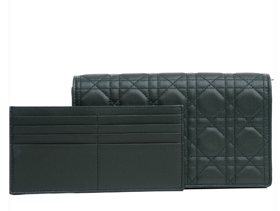 The Lady Dior pouch, crafted in green calfskin, is distinguished by its Cannage topstitching with a Diamond motif and a removable 'D.I.O.R.' charm. The unique accessory may be worn with or without its chain strap and features two removable elements, a card holder and a zipped pouch. Each may be carried individually. Boasting the House's iconic motif in a graphic version, the pouch will instantly stand out and pairs effortlessly with other pieces from the same line.
