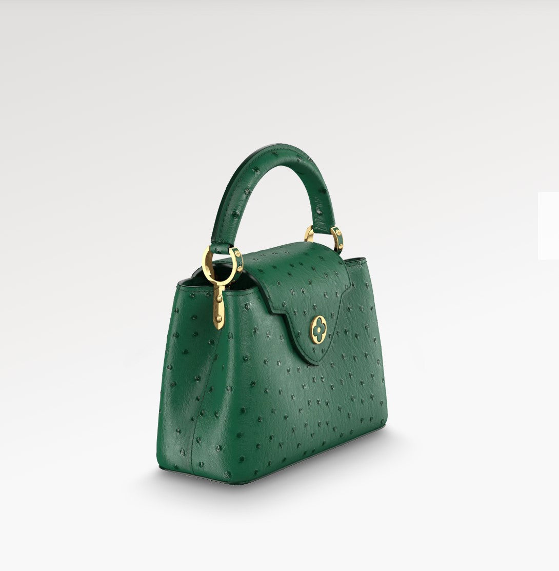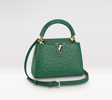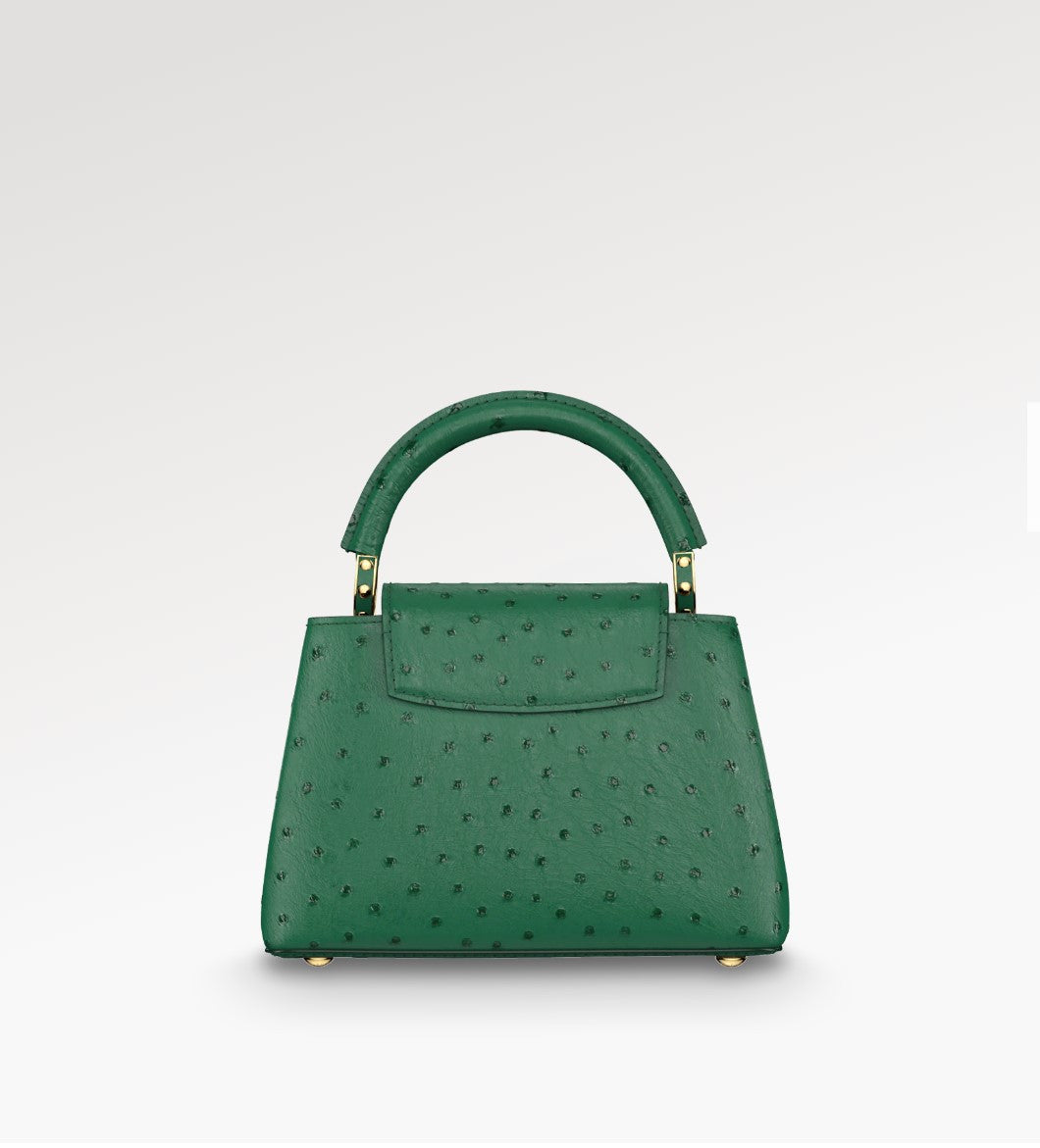 Richly crafted of ostrich skin, this Mini has all the details that make Capucines so covetable: leather-covered LV signature, jewel-like handle rings; and distinctive two-way flap. Offered in Menthe, a statement shade of green, with silver-colour hardware.