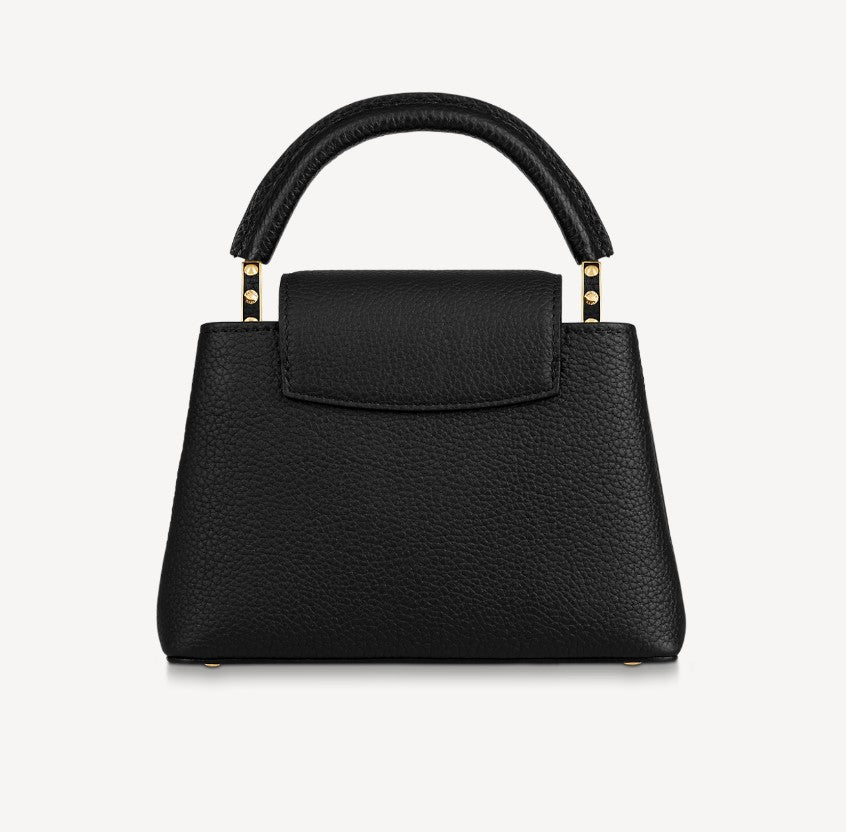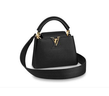 The refined Capucines Mini handbag looks stunningly chic in rich black Taurillon leather finished with golden handle rings and the emblematic LV Initials. This smaller version of the classic Capucines is a pleasure to carry over the shoulder or cross-body thanks to its wide removable strap..
