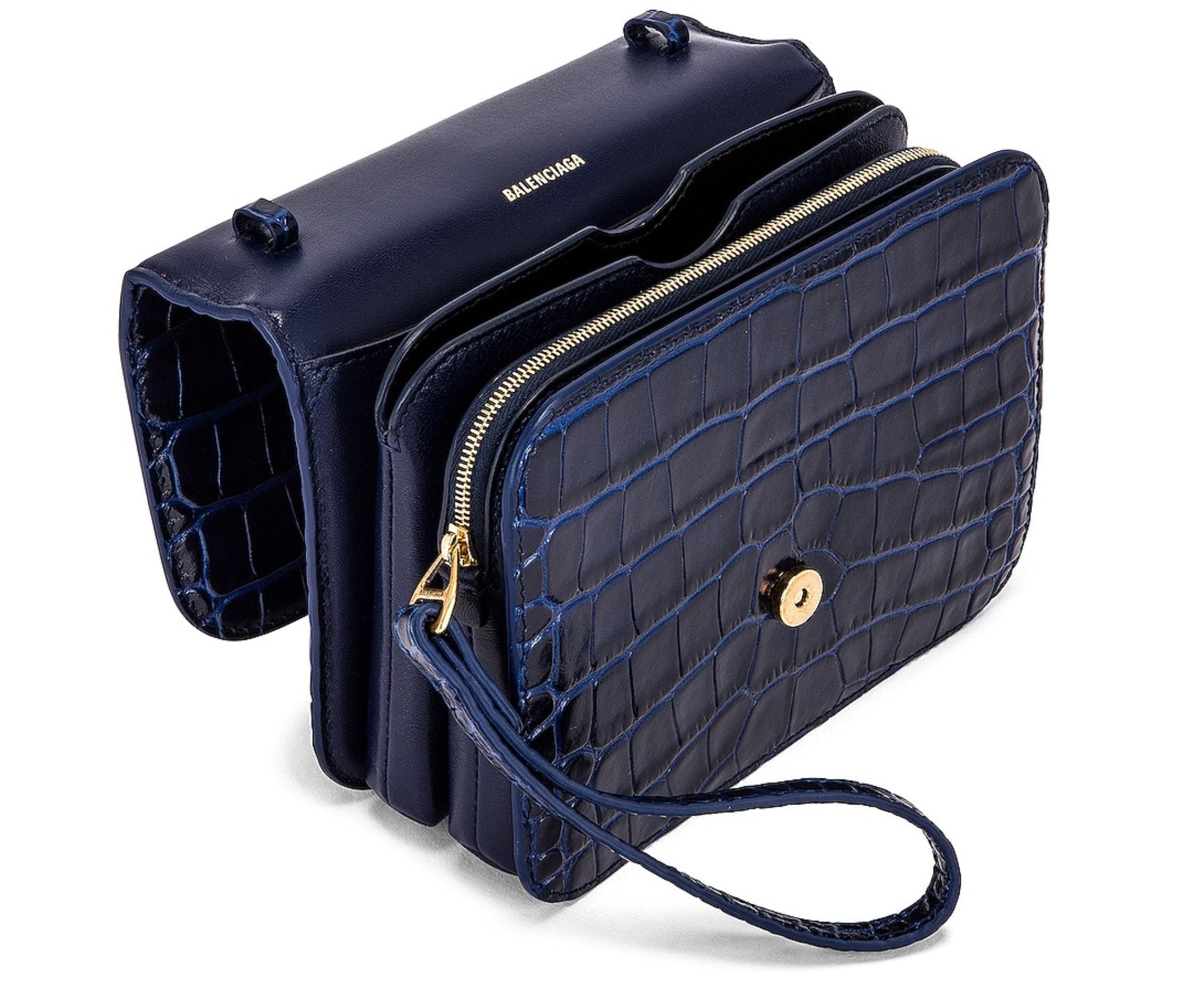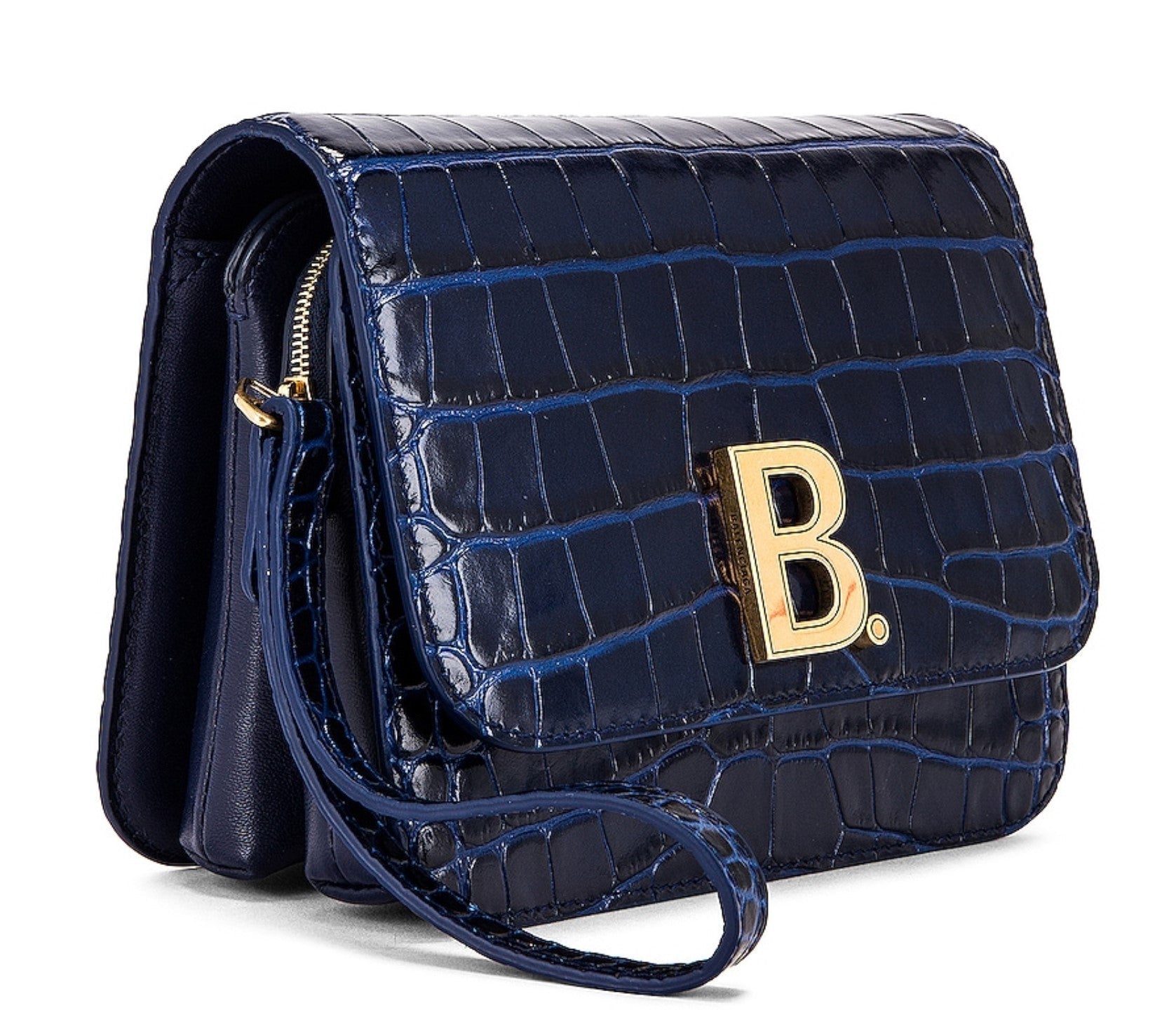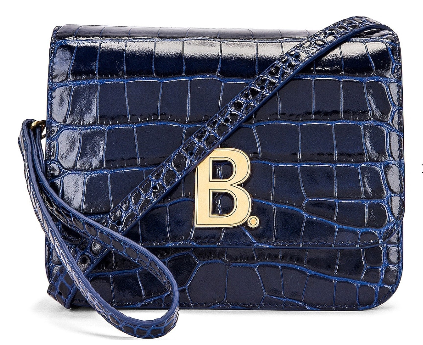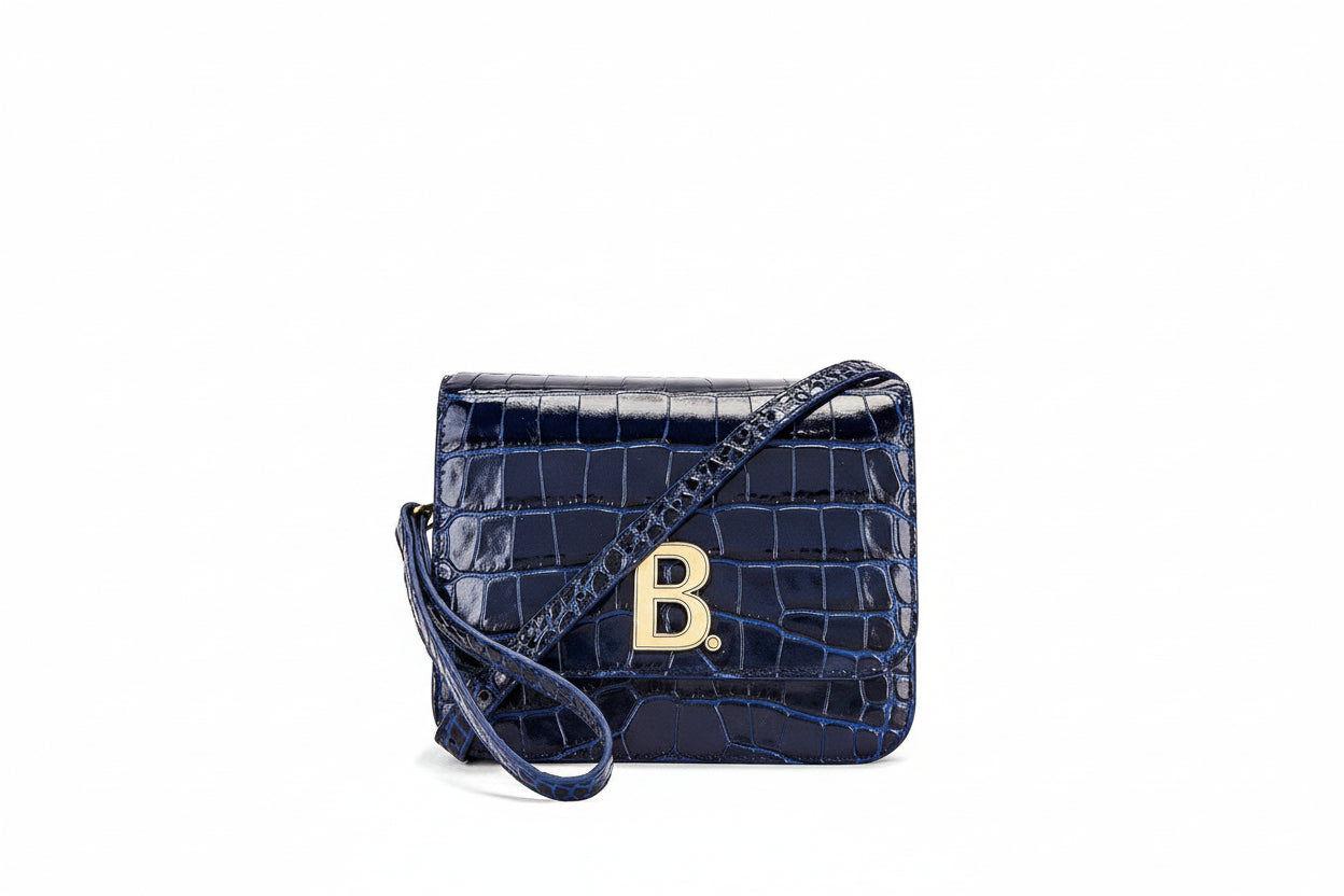 · Croc embossed leather with canvas lining and antique gold-tone hardware. Made in Italy. Adjustable and detachable shoulder strap measures approx 137 cm in length. Fold-over flap top closure with magnetic button fastening. Back slot pocket. Tow interior compartments with zip pocket divider. Interior slot pocketLogo hardware detail at face. Our Style No. BALF-WY298. Manufacturer Style No. 592898-1LR7M.!Single top handle· Clasp fastening