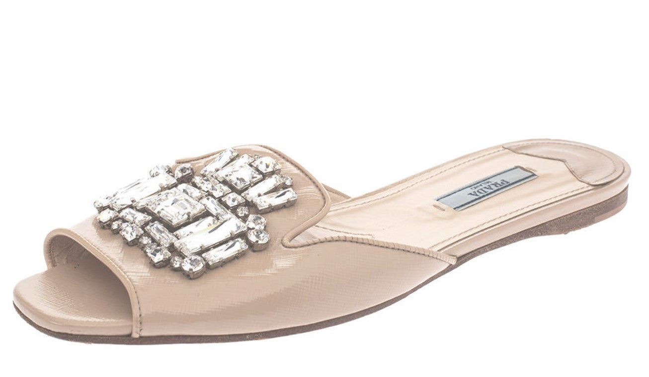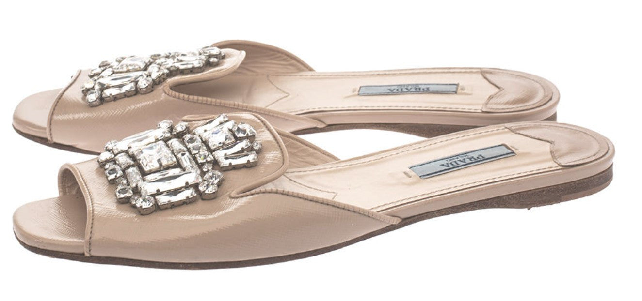 Wear these stylish slides from the house of Prada and channel your inner fashionista. Transform into the style diva when you are wearing these beige sandals on your feet. Keep it casual and chic with these patent Saffiano leather slides that are styled open toes and crystal embellished vamps. They are finished with silver-tone hardware.
