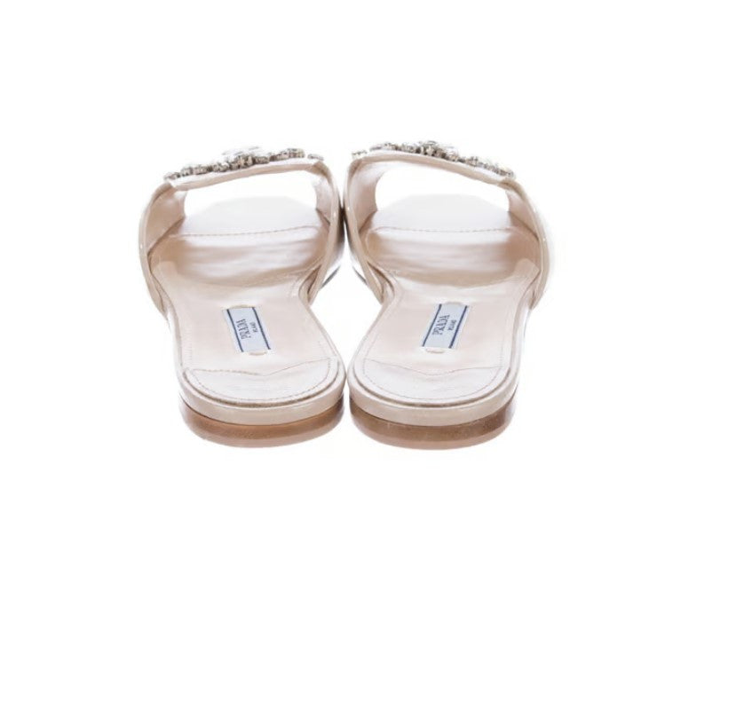 PRADA BEIGE PATENT SAFFIANO LEATHER EMBELLISHED FLAT SLIDES