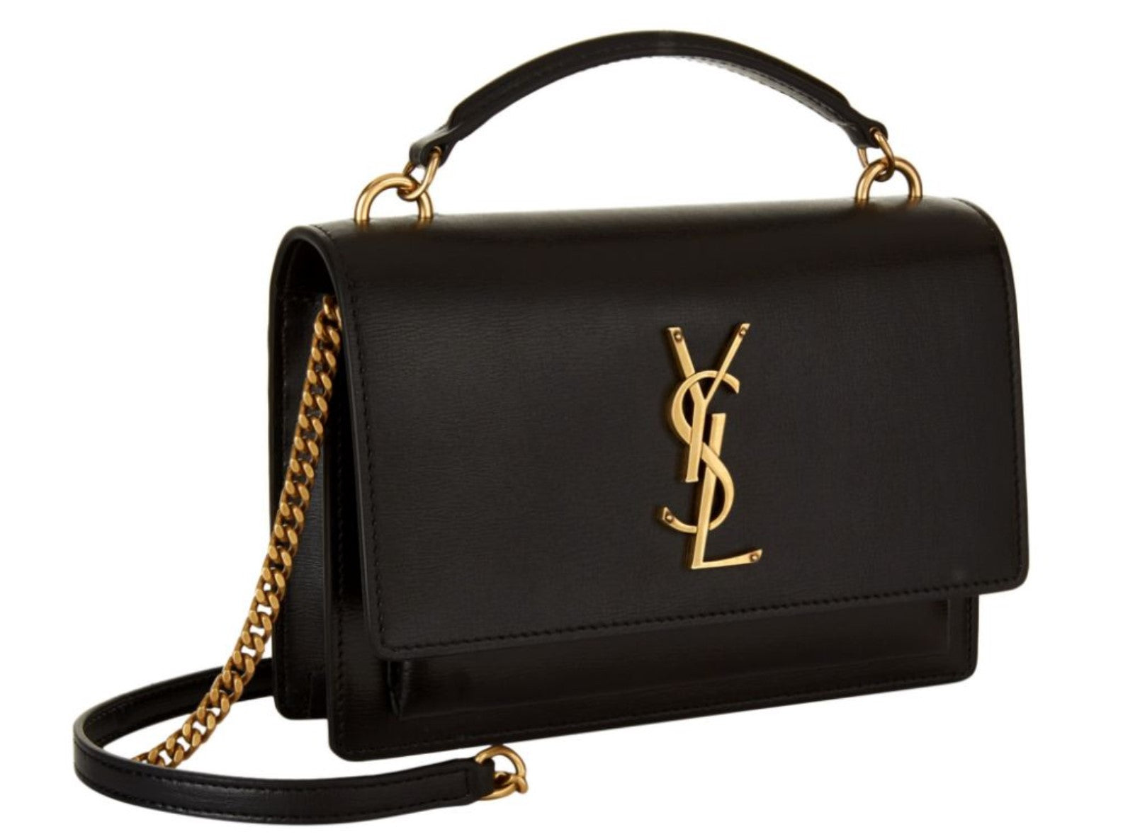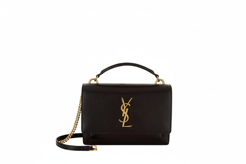 SAINT LAURENT's classy aesthetic is encapsulated in the covetable Sunset Satchel. Constructed in smooth calfskin leather, it is embellished with an iconic YSL monogram in bronze-tone metal and a logo-embossed key-ring tab. Hold the top handle or carry this Italian-made piece using the adjustable chain strap.