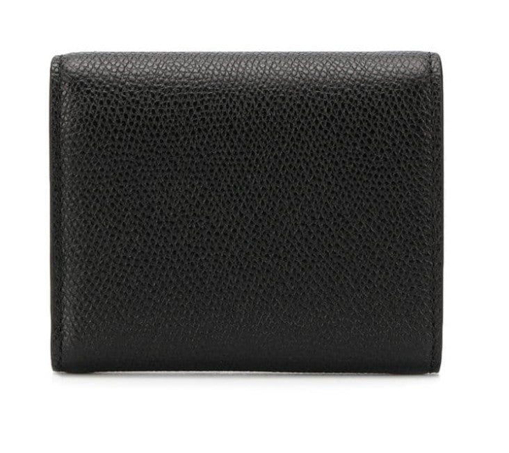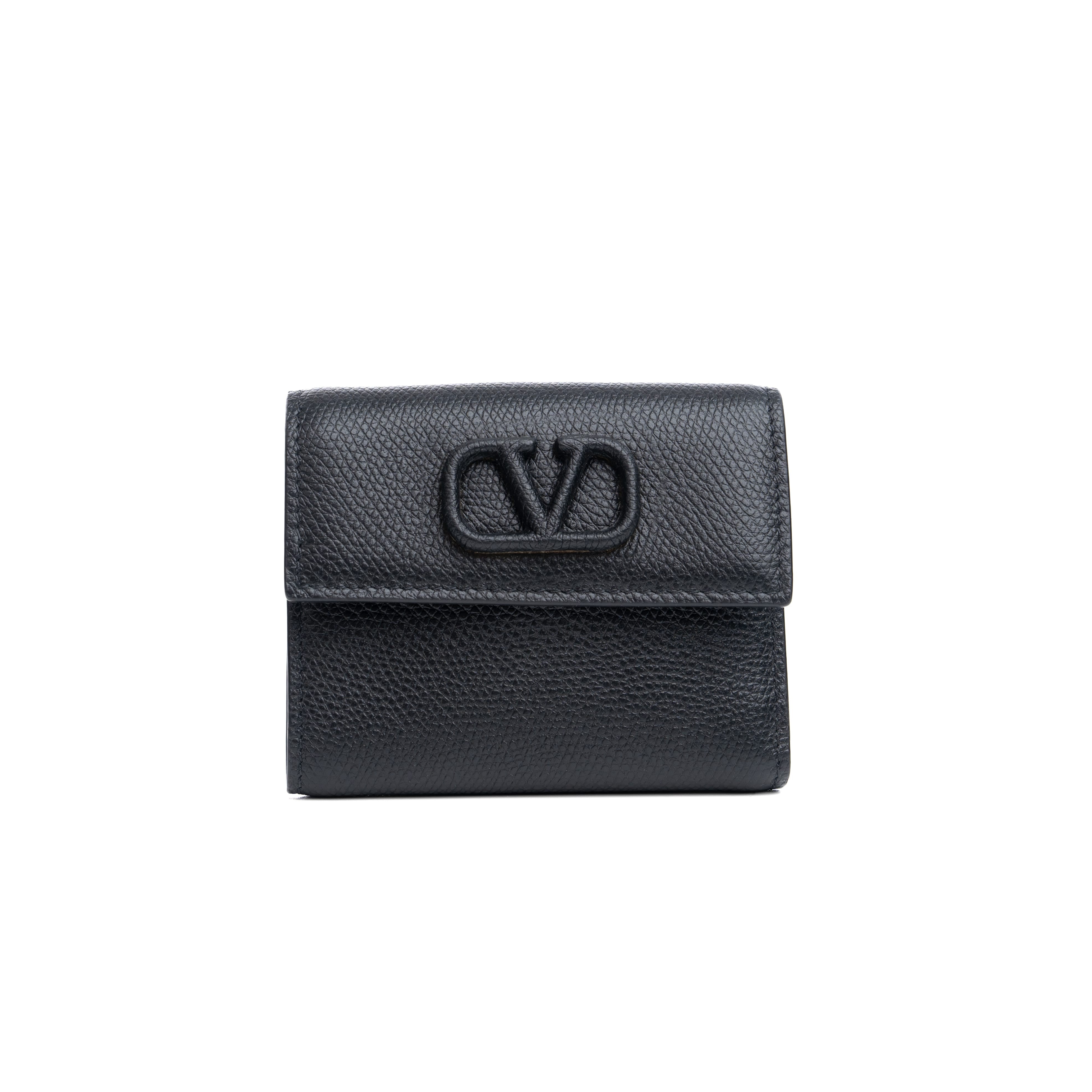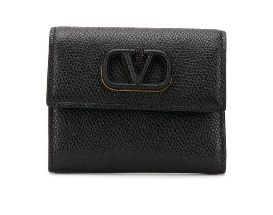 Small Valentino Garavani VSLING grainy calfskin leather wallet with VLogo Signature closure. Keep all things financial tucked away in this compact tri-fold wallet. Punctuated with a leather-covered VLOGO detail, this compact accessory is designed with multiple interior compartments for maximum utility
