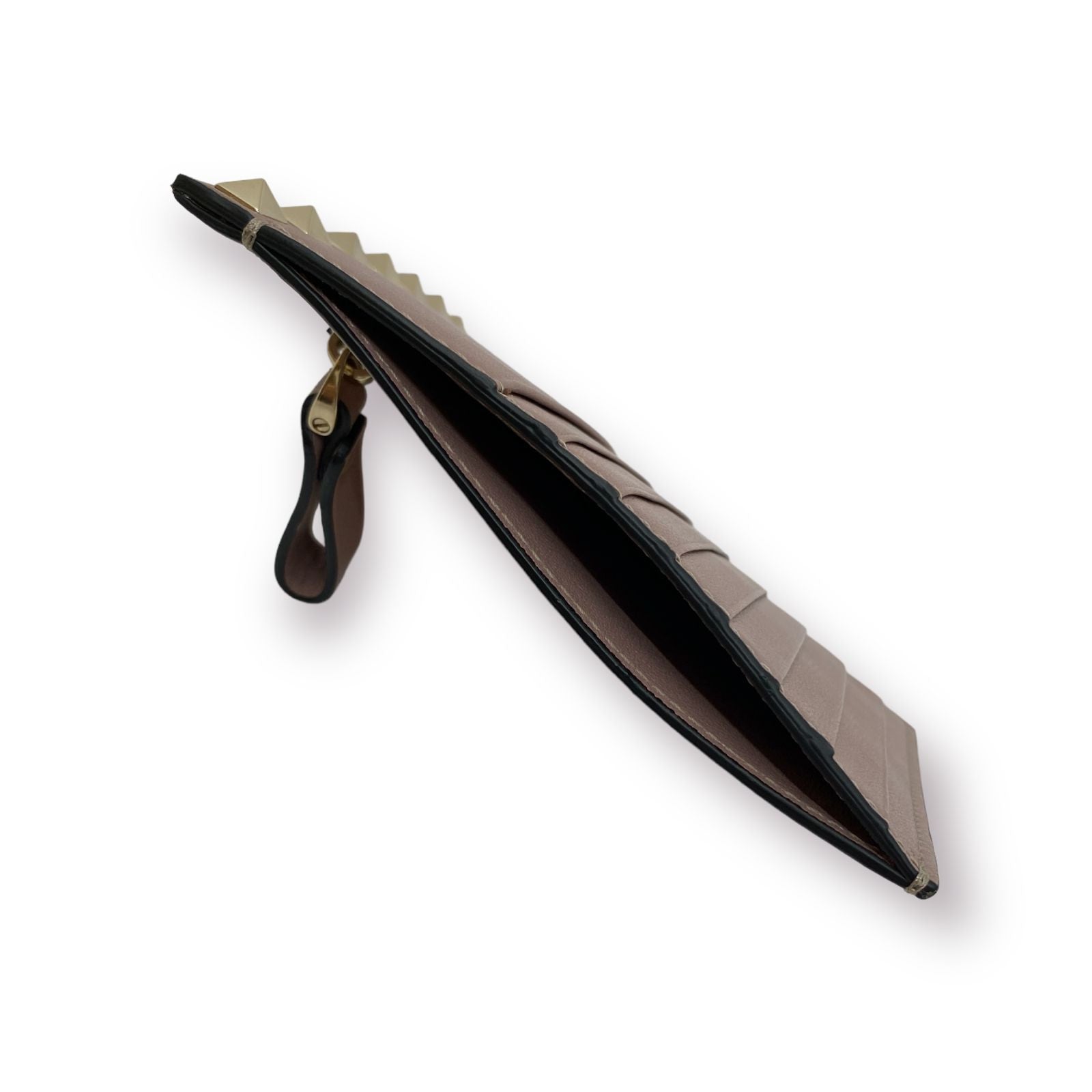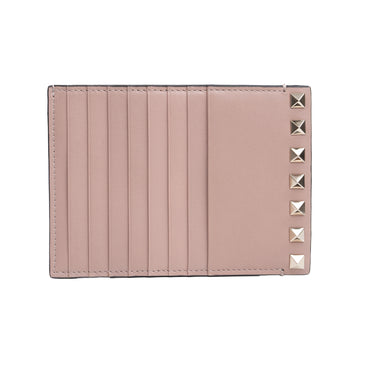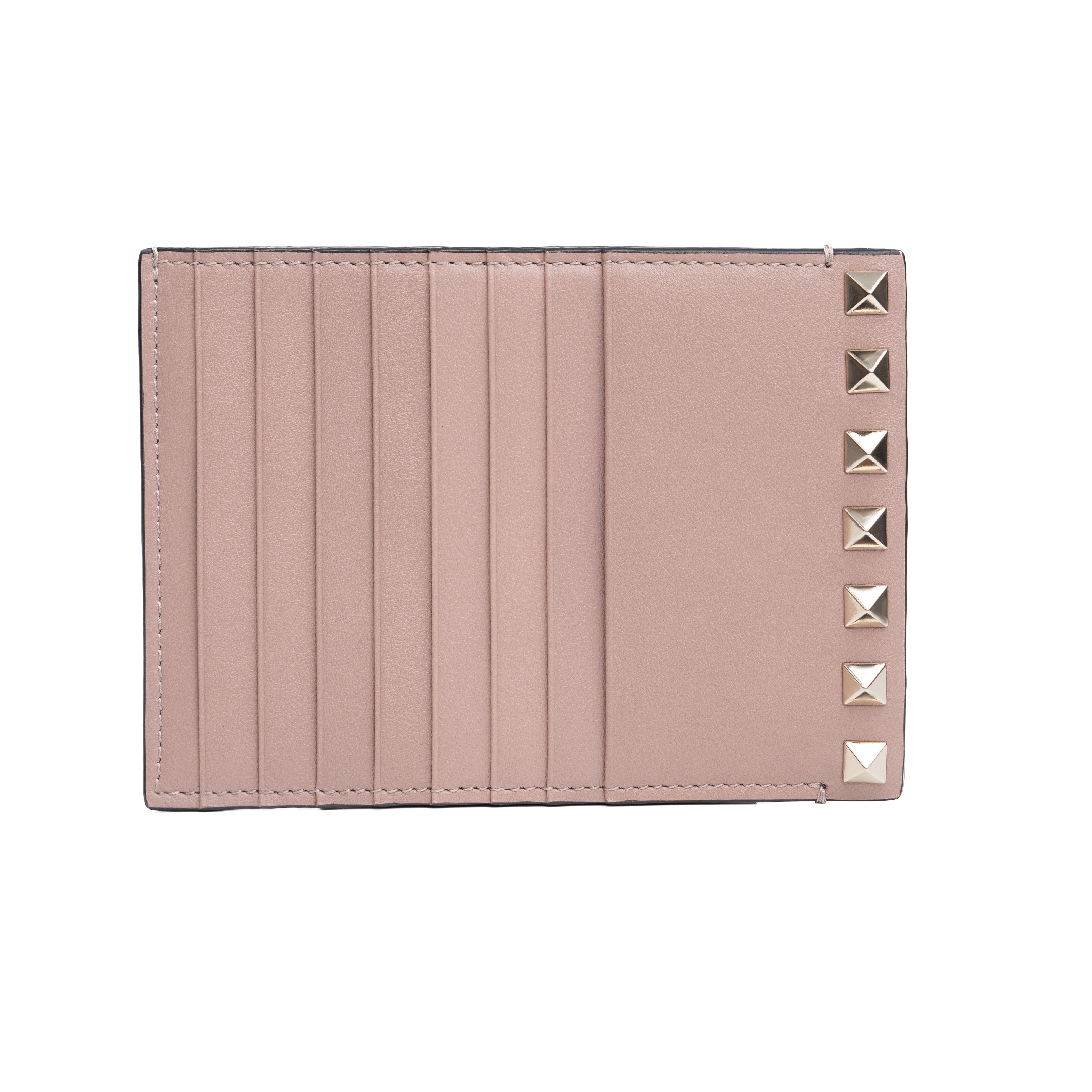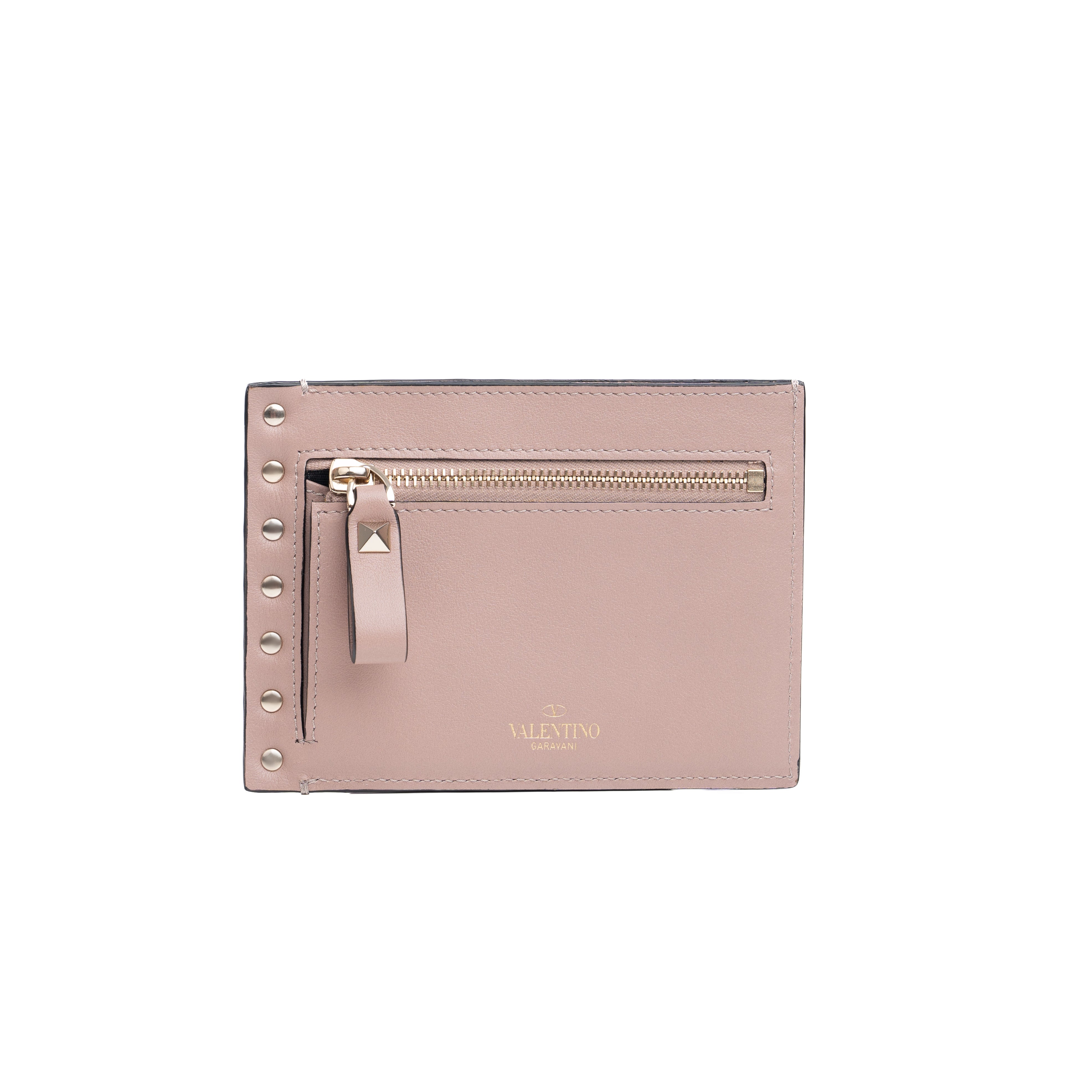 elevates this daily essential with a touch of glamor. Crafted from pink calfskin, this coin purse is embellished with gold-tone pyramid Rockstuds for an edgy touch. The iconic logo stamp takes prime position on the back.