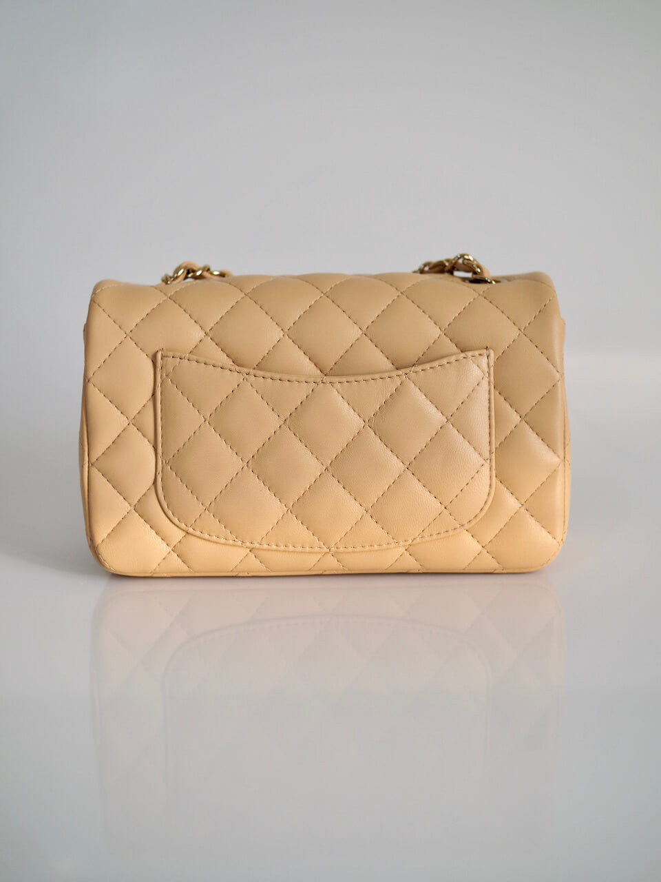 22C Timeless Beige Lambskin  CHANEL Mini Rectangular Flap bag with Gold Hardware.