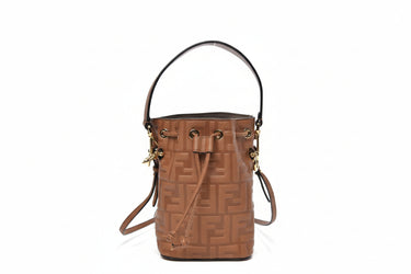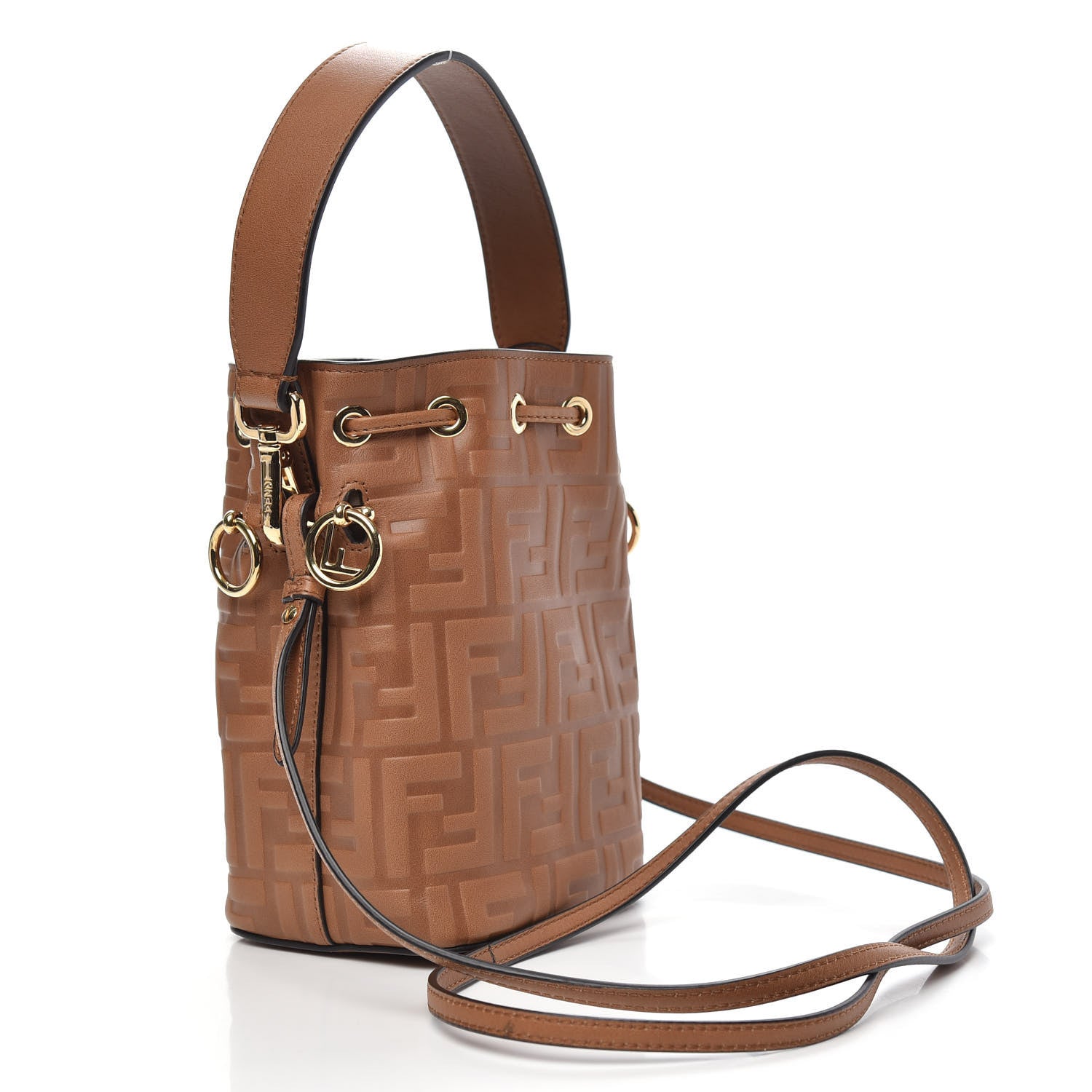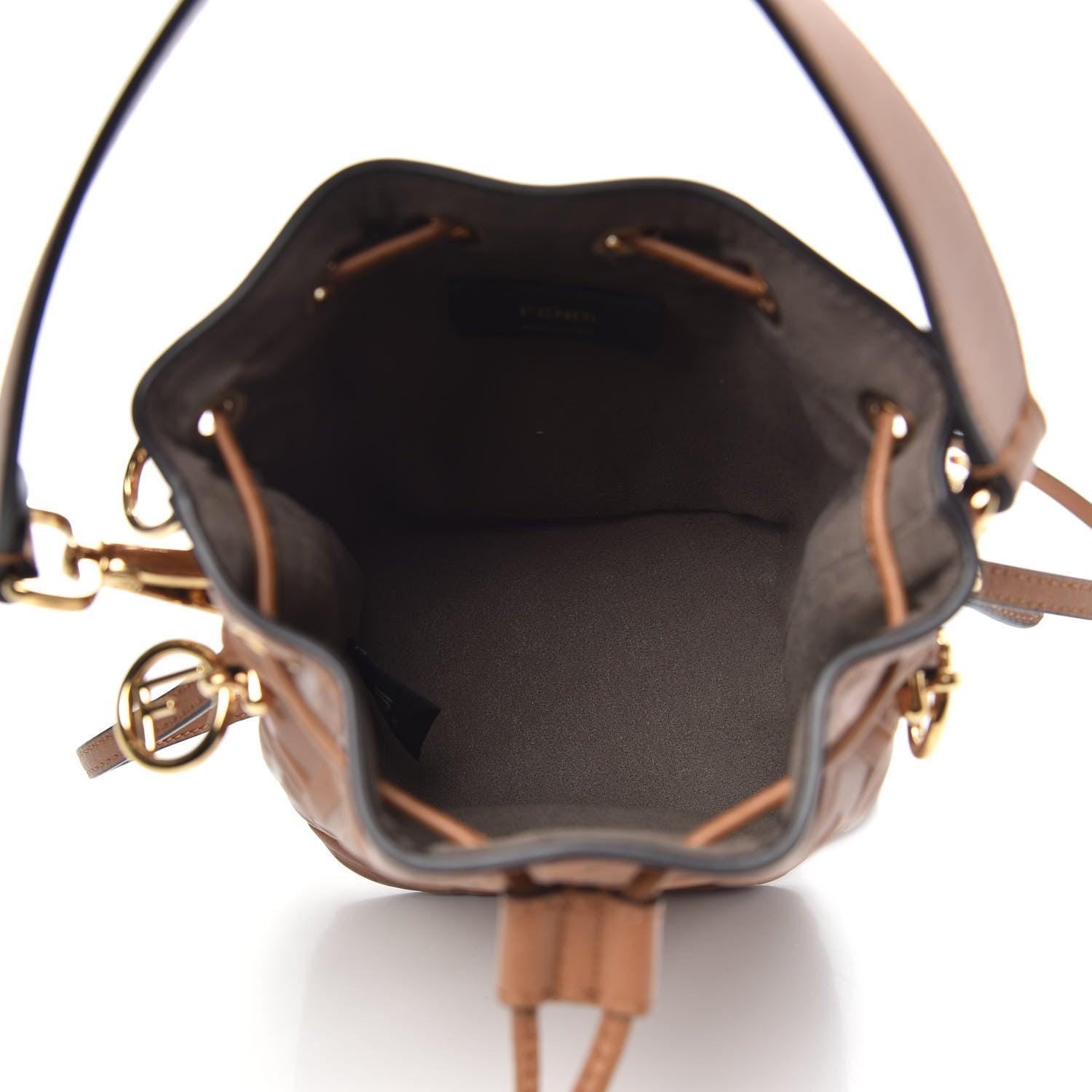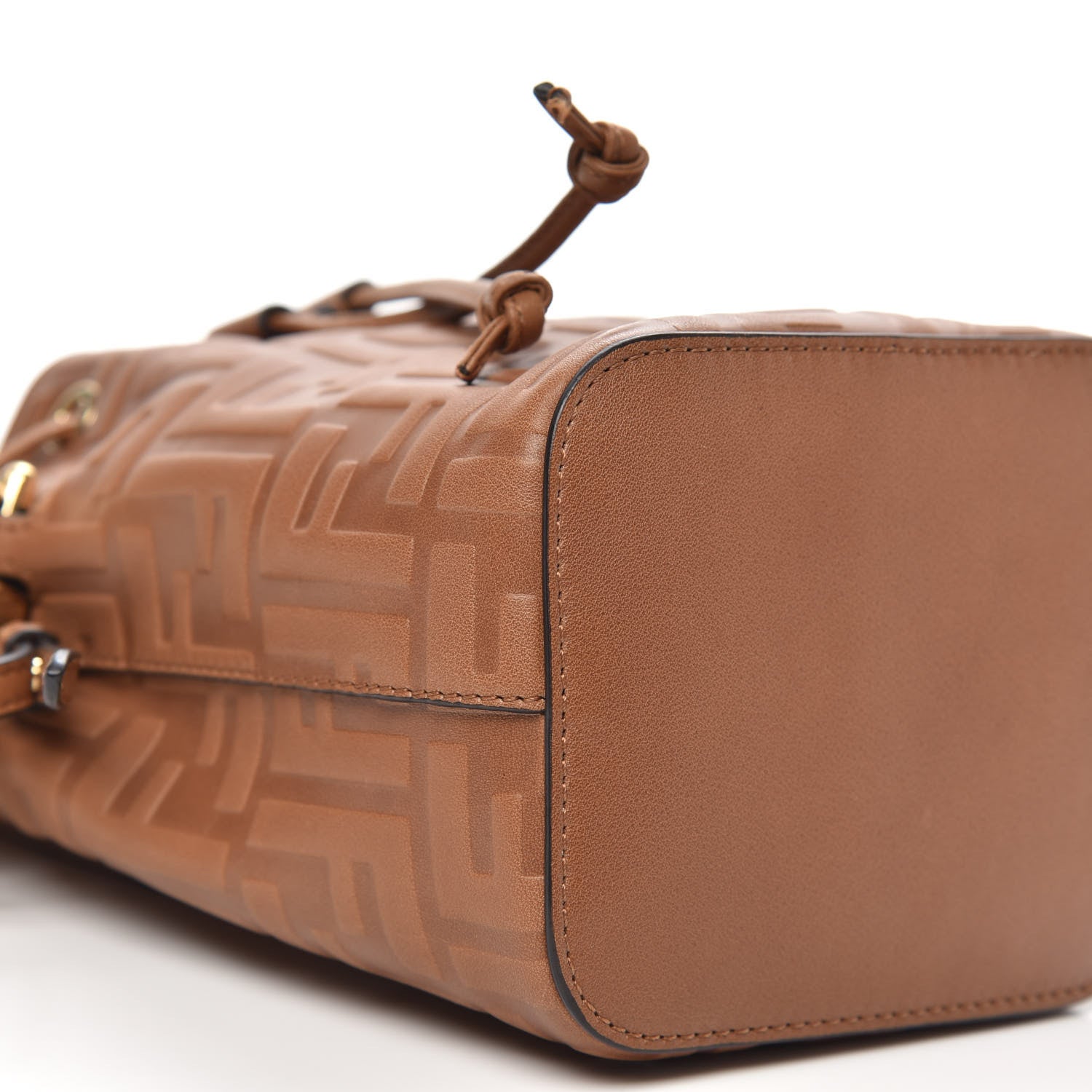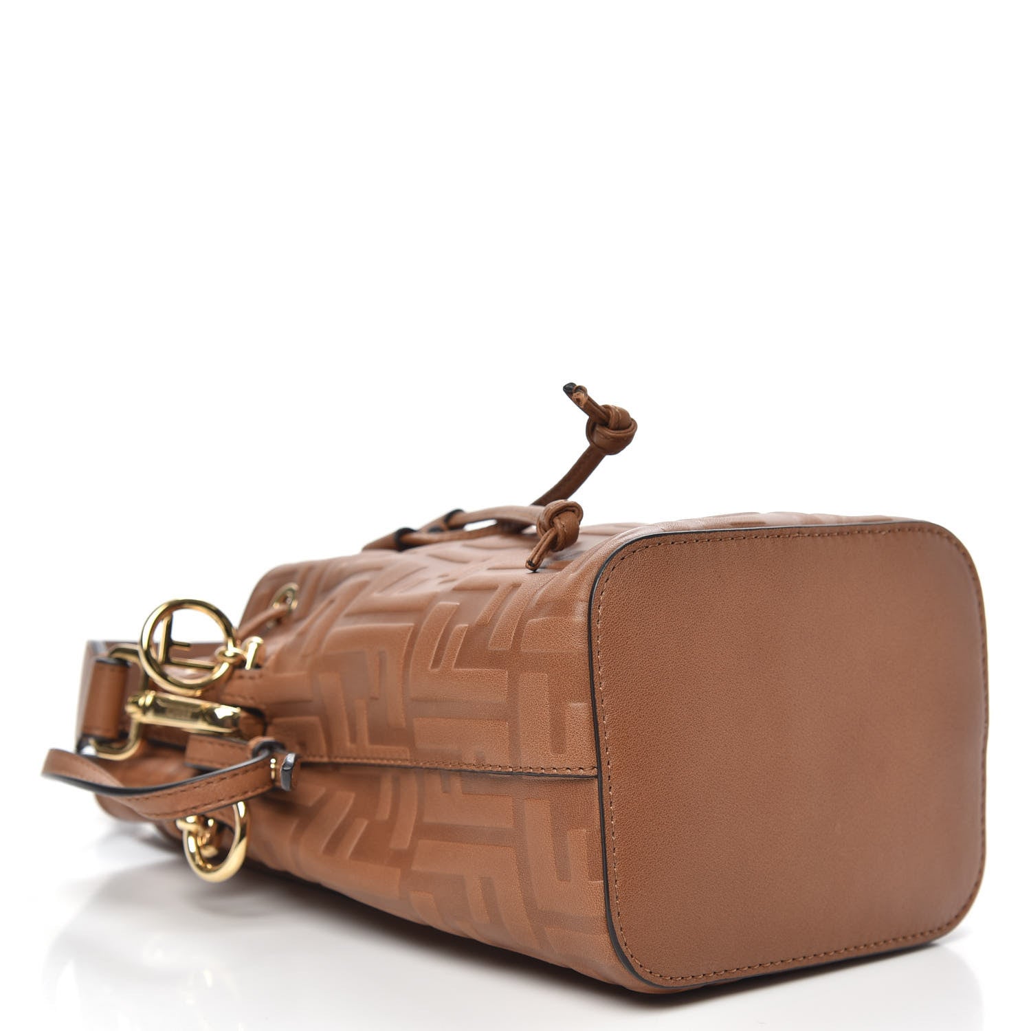 This is an authentic FENDI Calfskin F is Fendi FF 1974 Embossed Mini Mon Tresor Bucket Bag in Cuoio. This chic tote is crafted of FF monogram embossed leather in light brown. The bag features a leather shoulder strap, polished gold hardware, and a leather top handle. The top is open to a taupe suede interior for your everyday necessities.