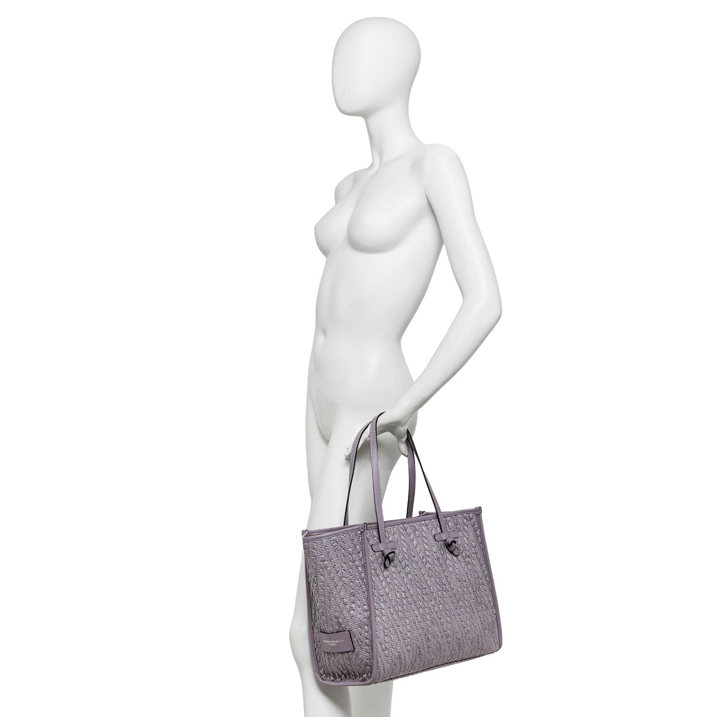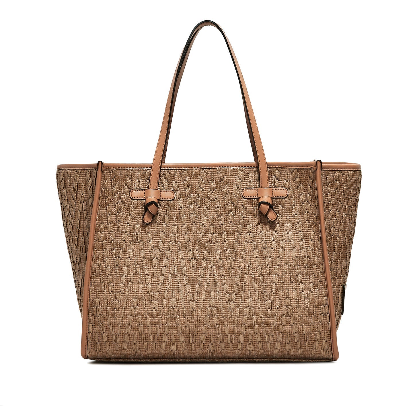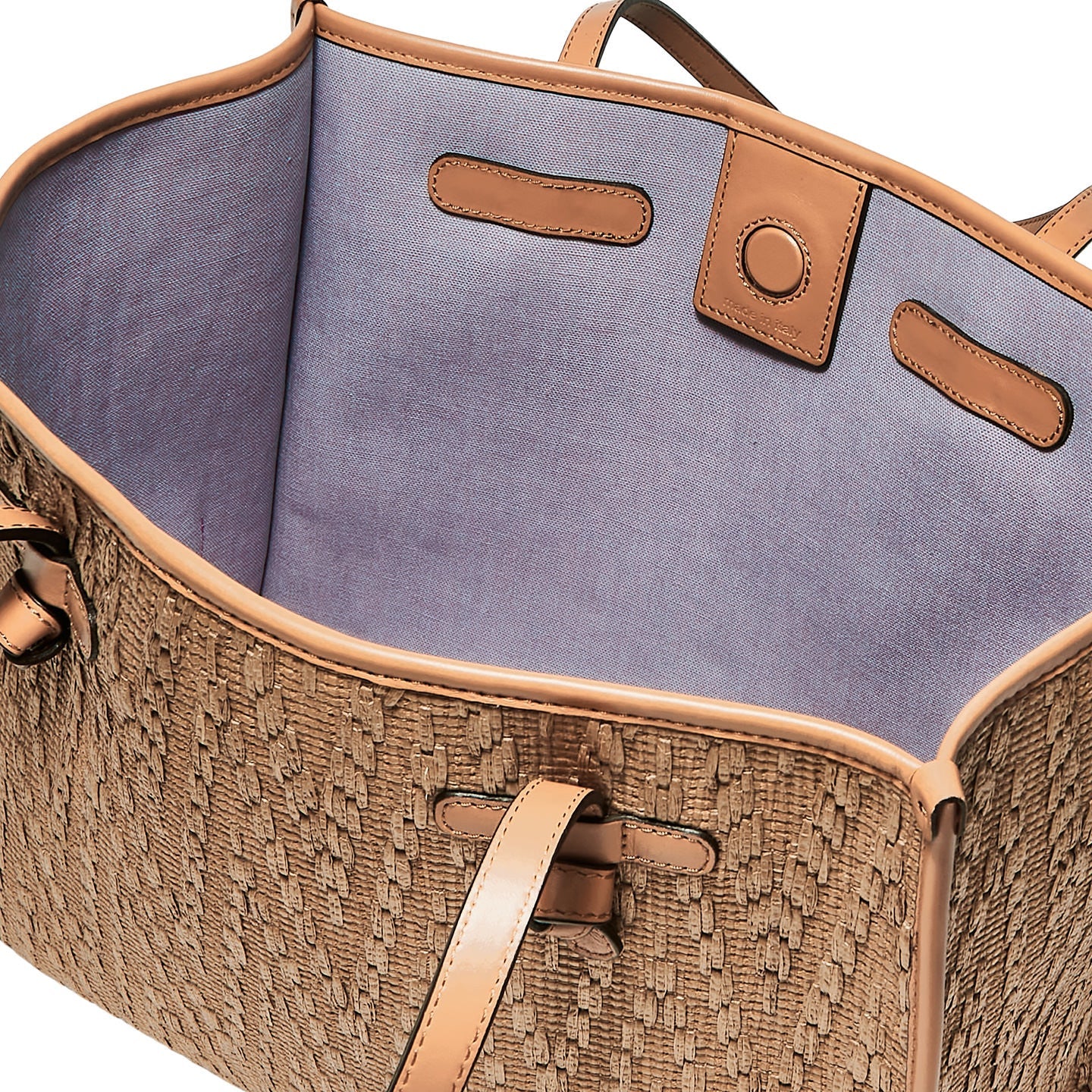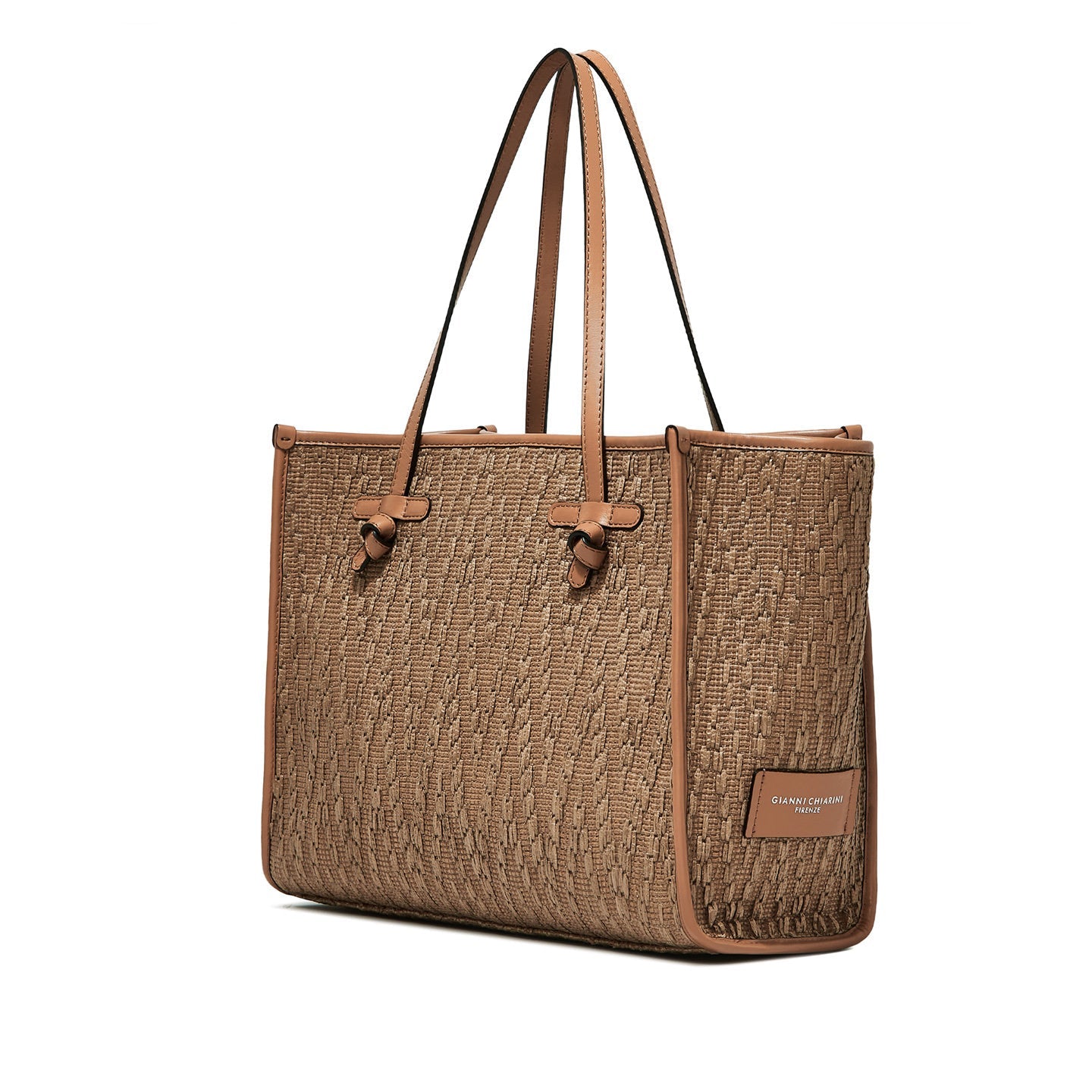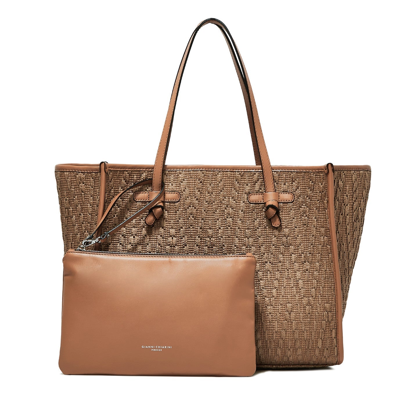 Marcella Gianni Chiarini shopping bag in woven straw. Minimal design, glam leather profiles. Perfect for everyday use, it features leather handles and a convenient magnetic clasp closure. The contrast lining and the leather clutch bag in the same color as the bag make this accessory unique in its kind. Size: 31x38x16 cm.