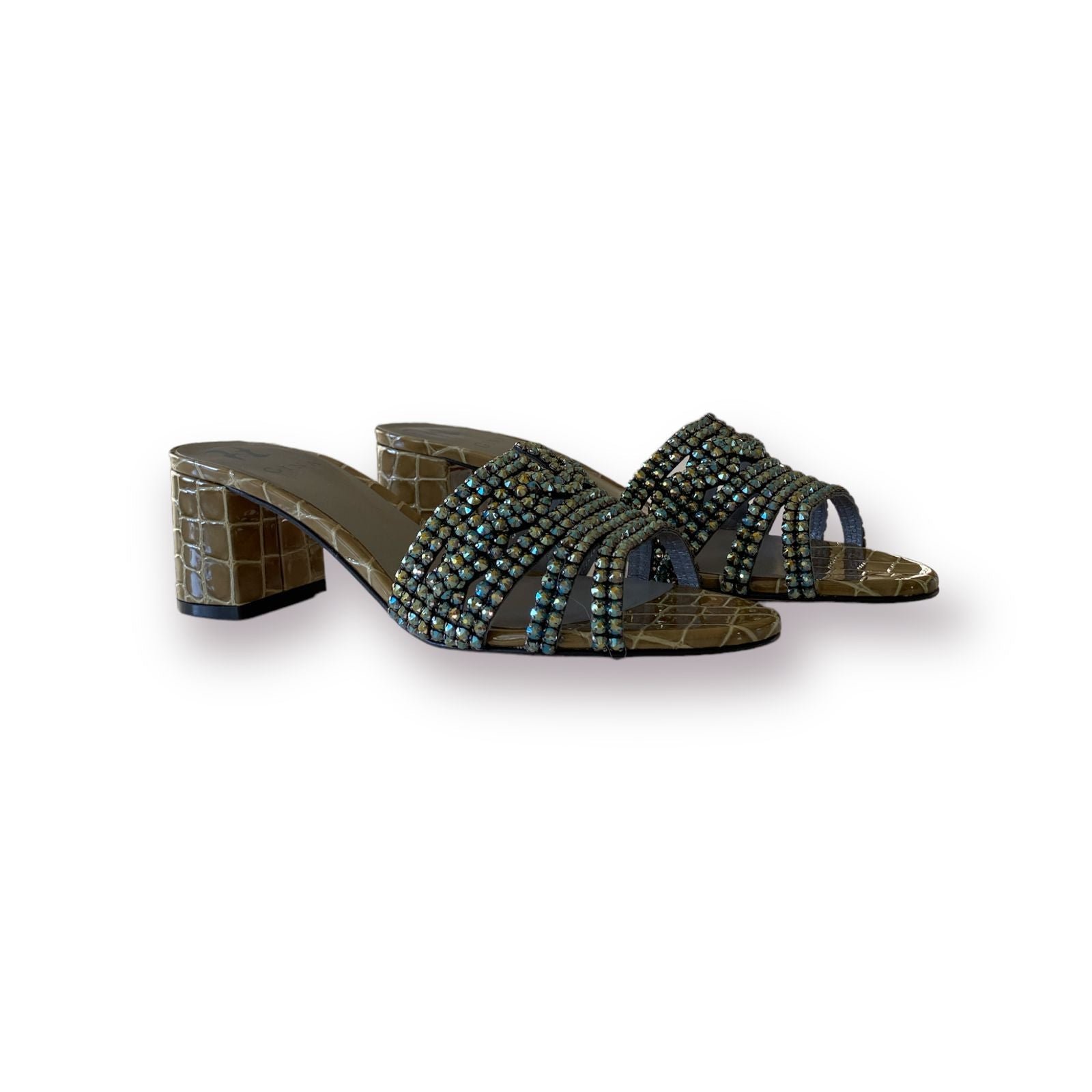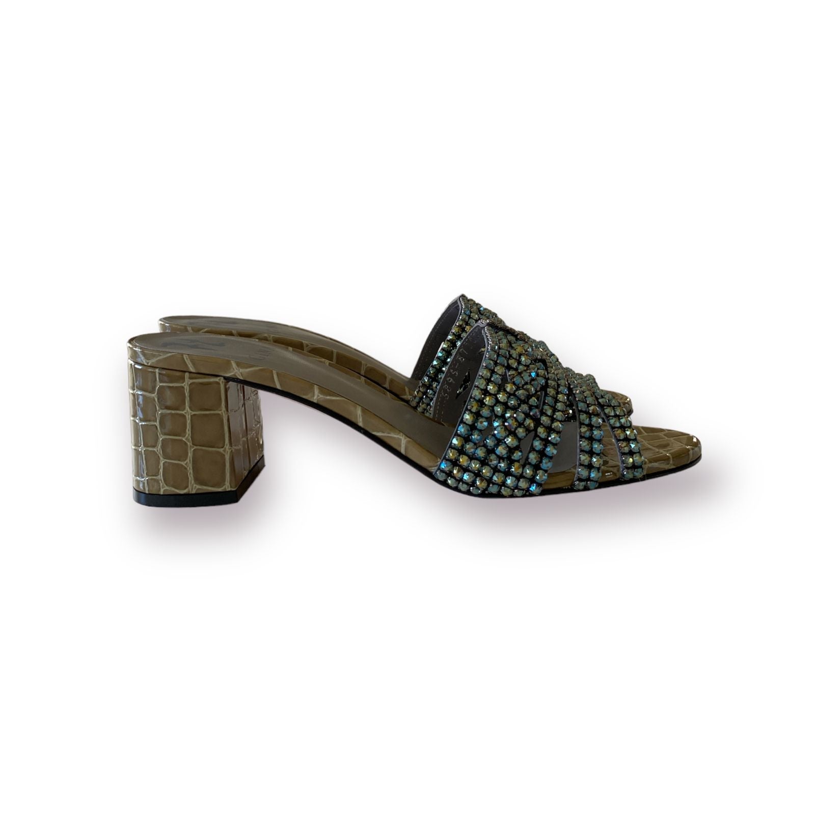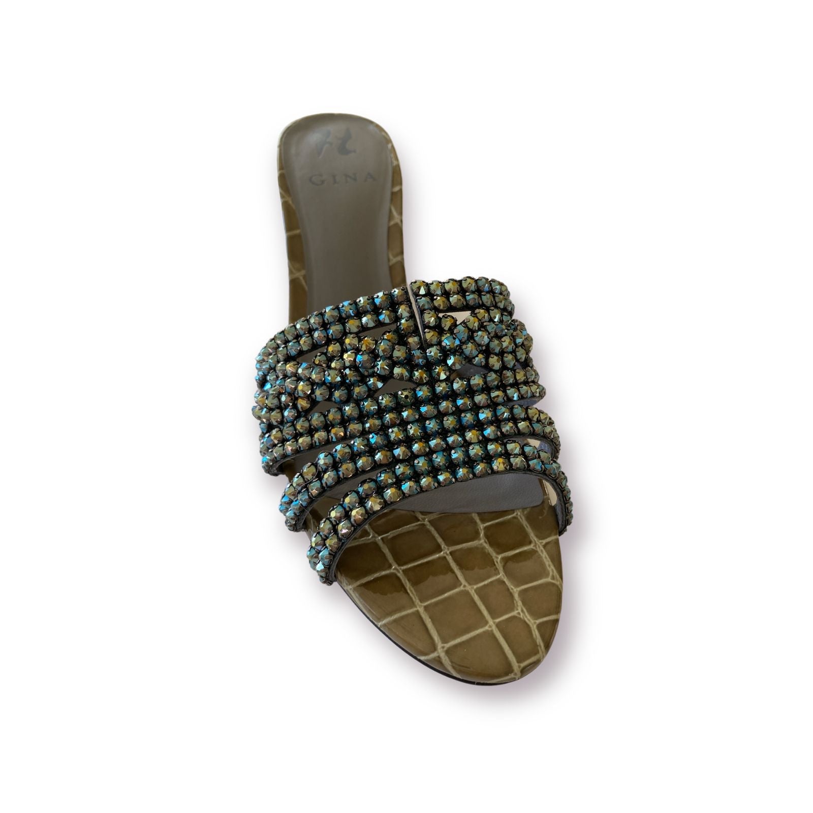 VISAGE a square-toe sandal on an effortlessly wearable 55mm architectural block heel, is the essential slipper to take from day to eveningwear. Embellished with a signature GINA sandal trim handmade with crystals from Swarovski®, and with a vibrant matching lining, VISAGE is the definition of versatile luxury.