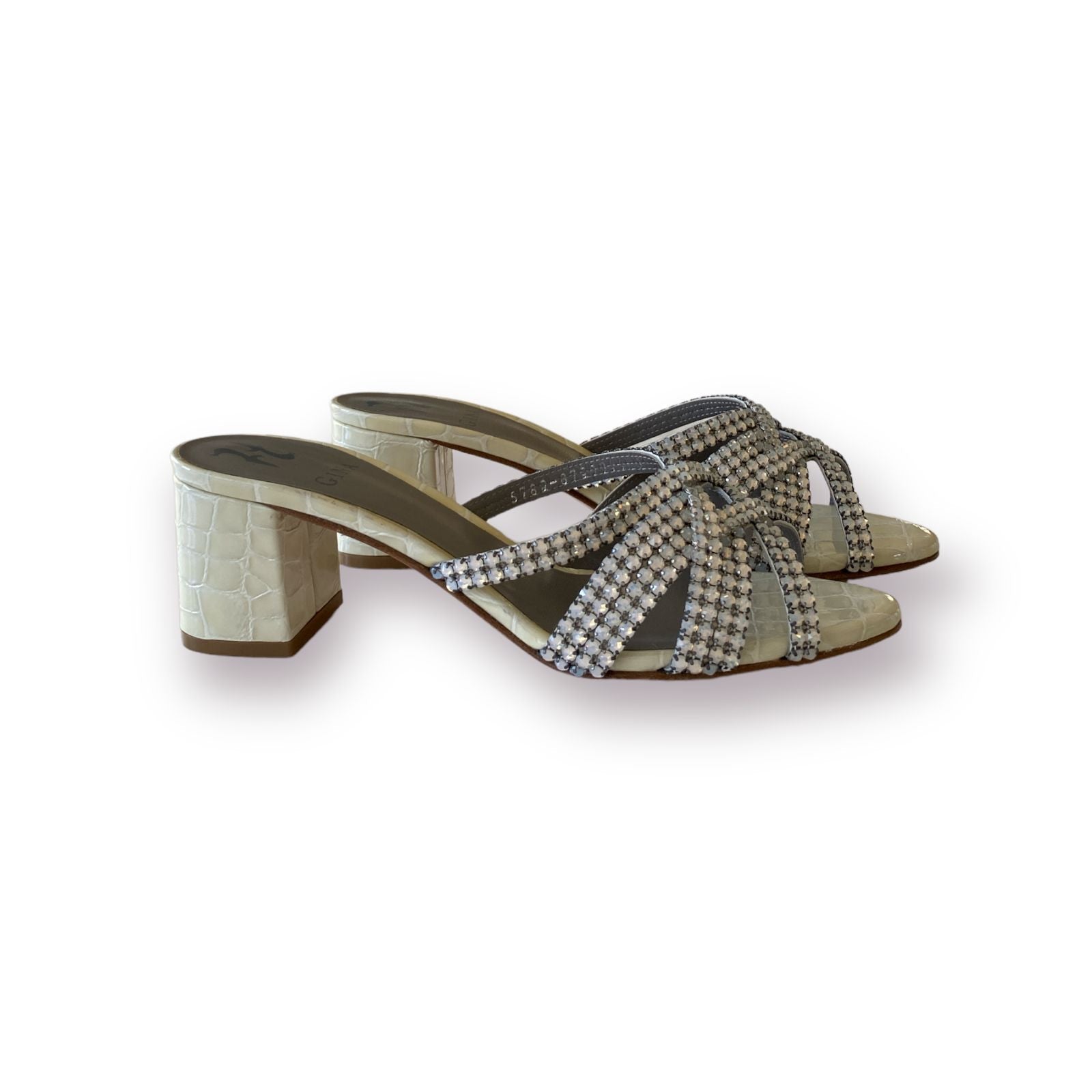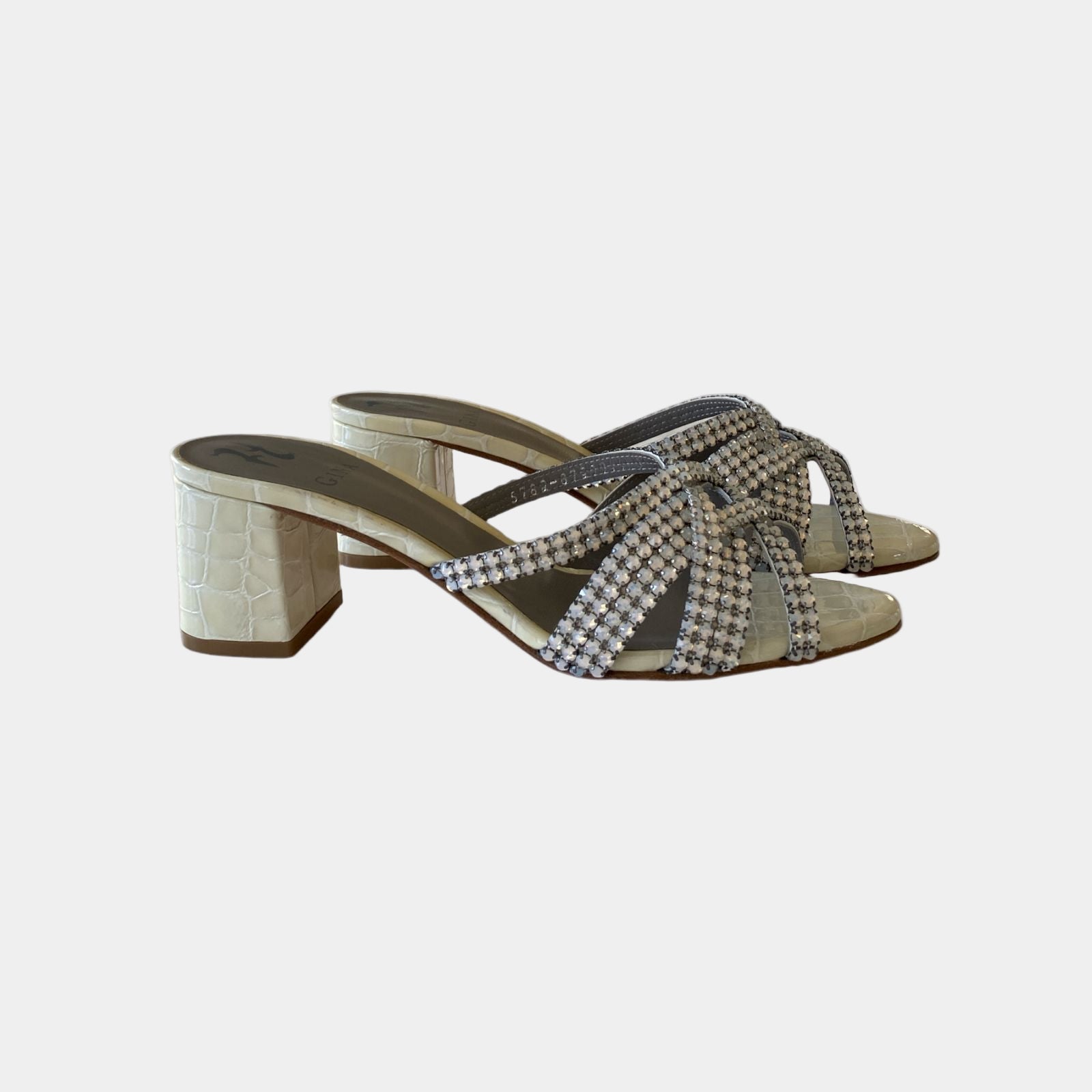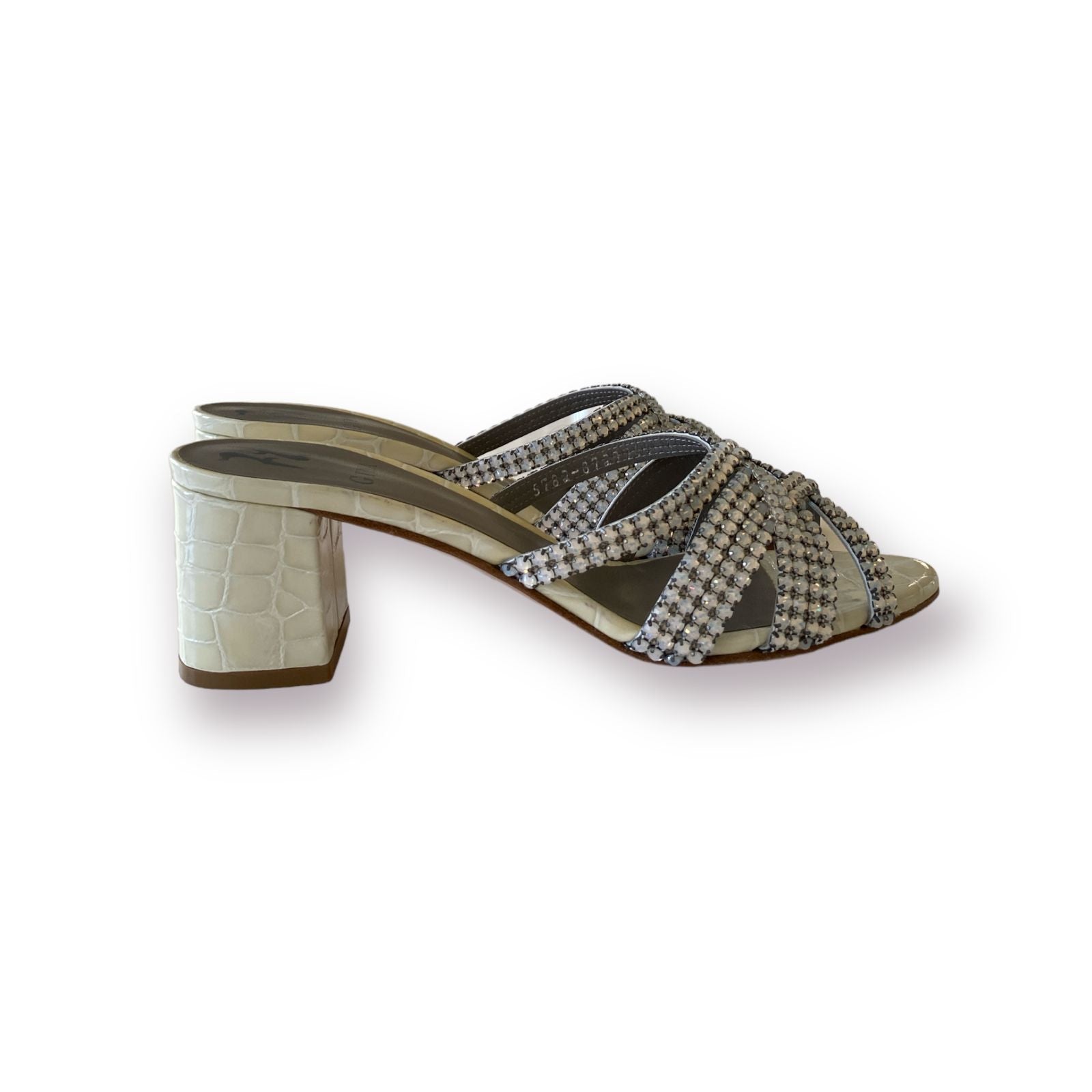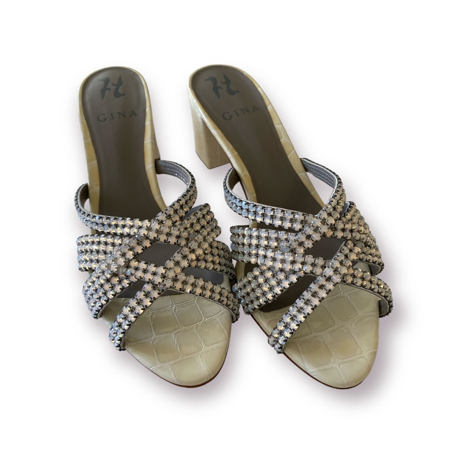 DEXIE a square-toe sandal on an effortlessly wearable 55mm architectural block heel, is the essential slipper to take from day to eveningwear. Embellished with a signature GINA sandal trim handmade with crystals from Swarovski®, and with a vibrant matching lining, VISAGE is the definition of versatile luxury.