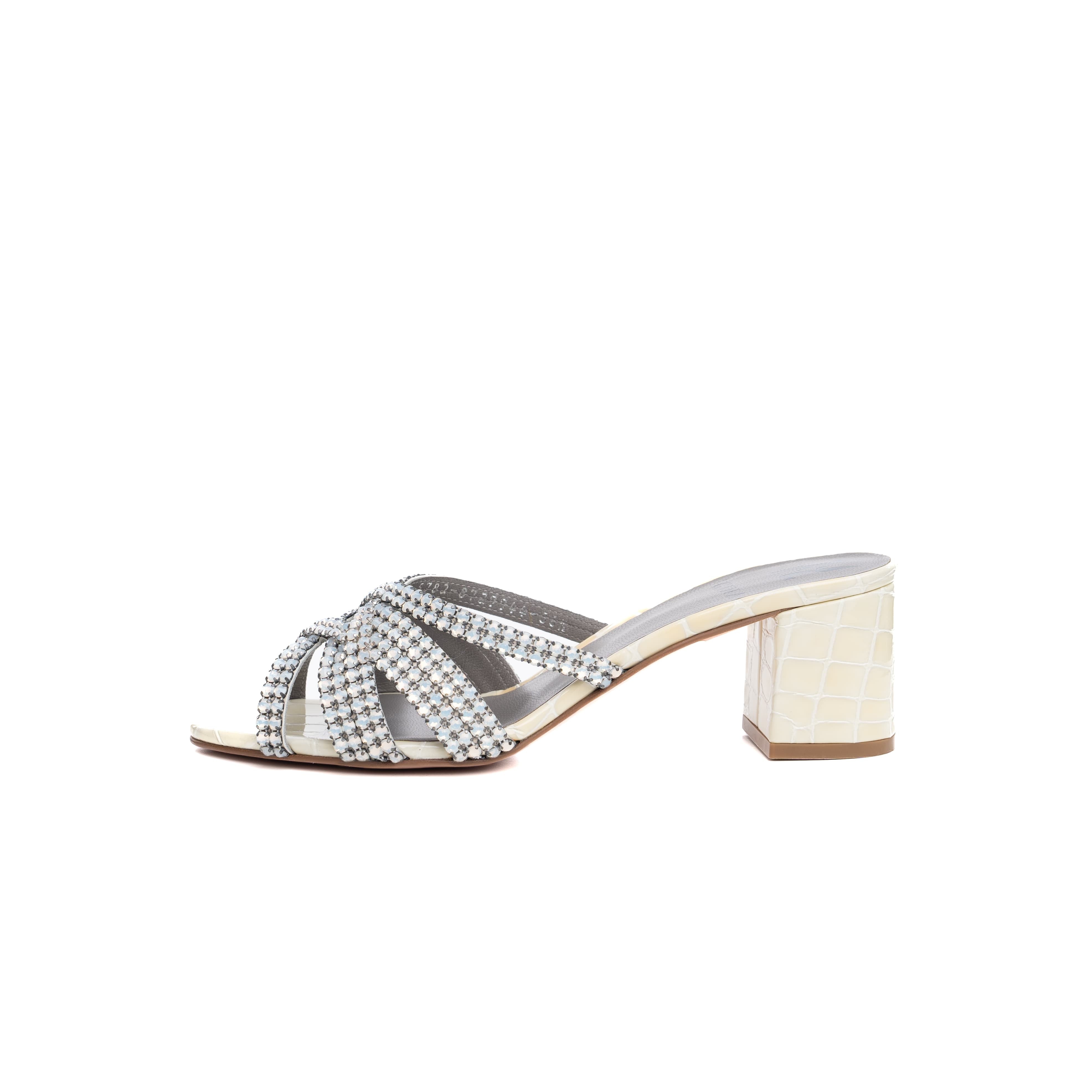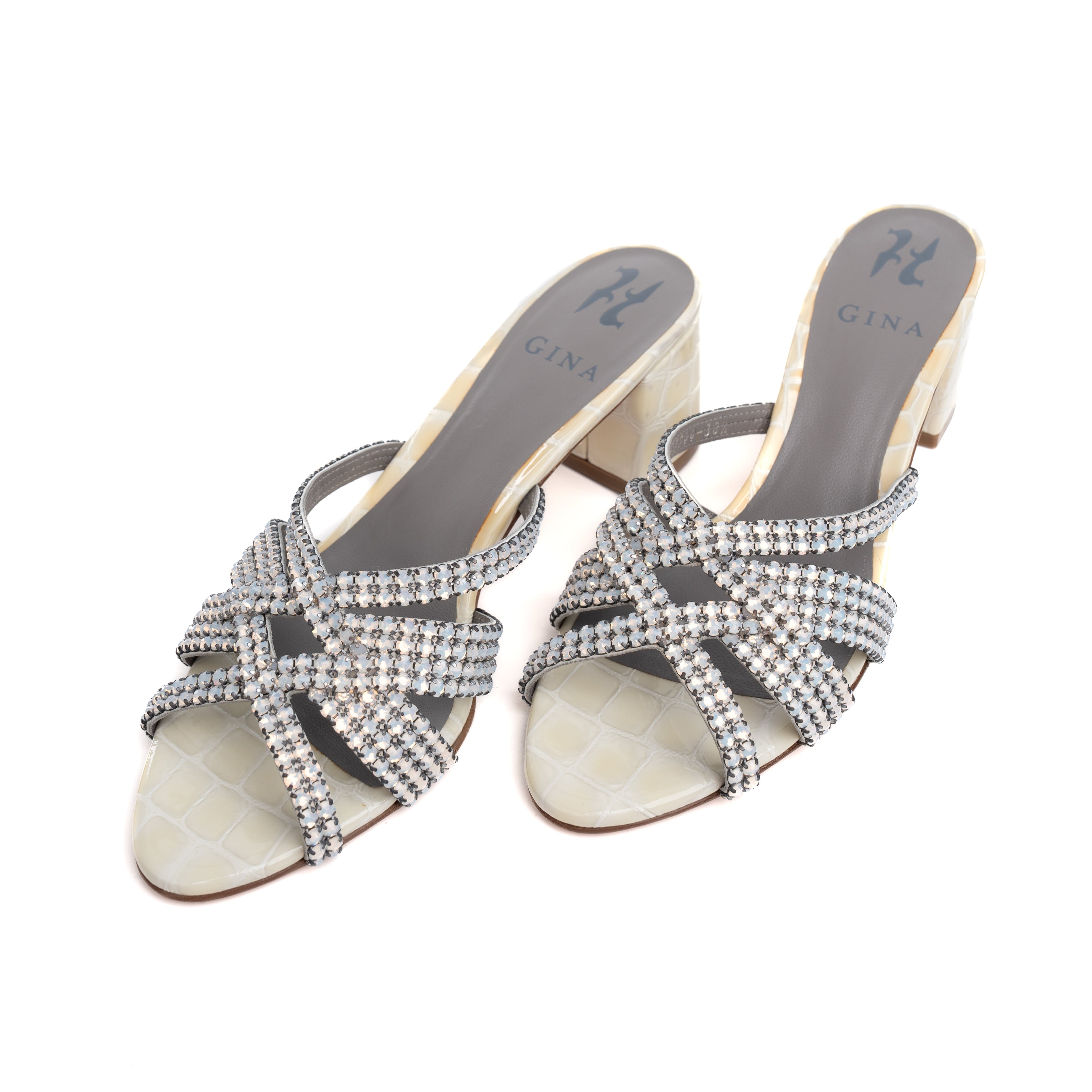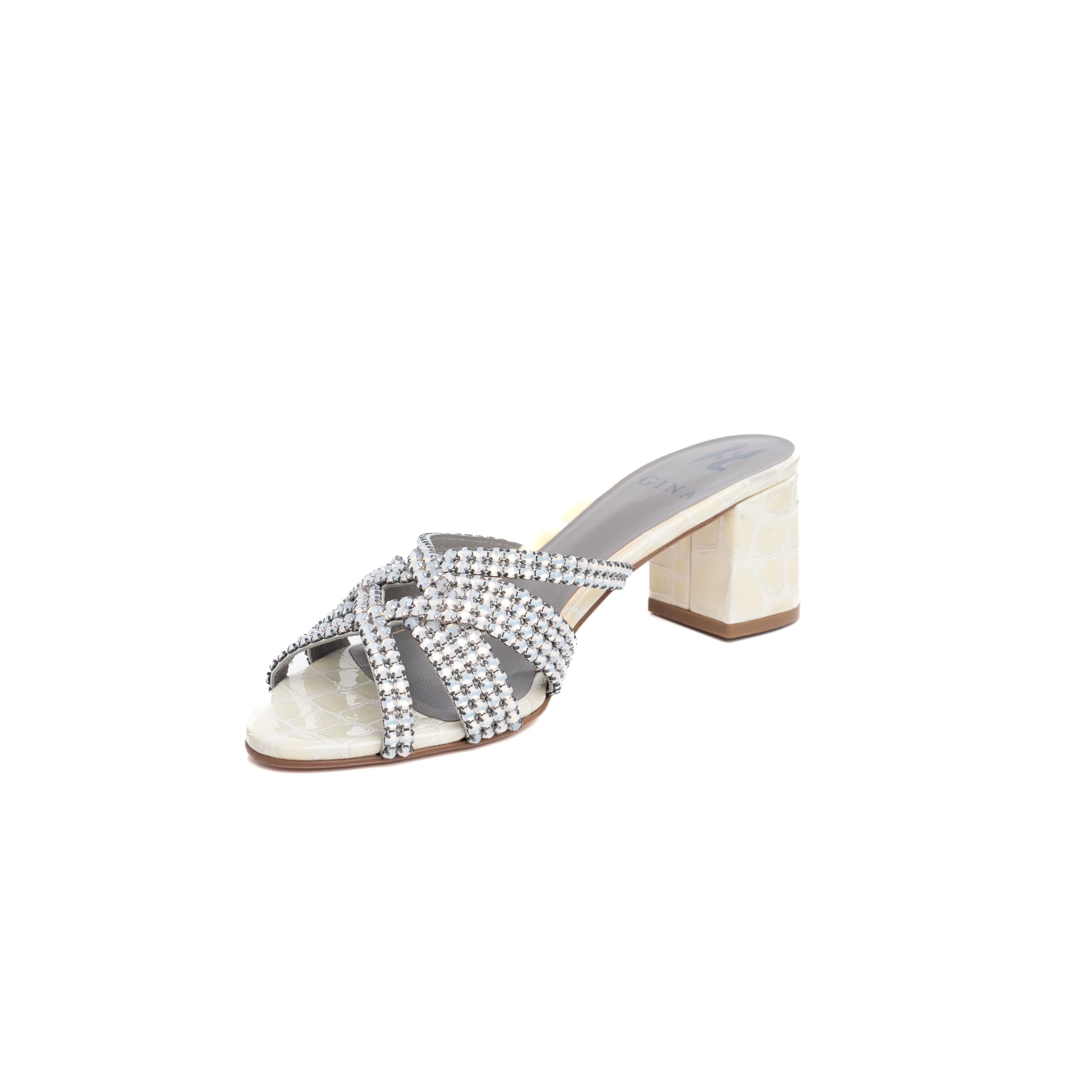 DEXIE a square-toe sandal on an effortlessly wearable 55mm architectural block heel, is the essential slipper to take from day to eveningwear. Embellished with a signature GINA sandal trim handmade with crystals from Swarovski®, and with a vibrant matching lining, VISAGE is the definition of versatile luxury.