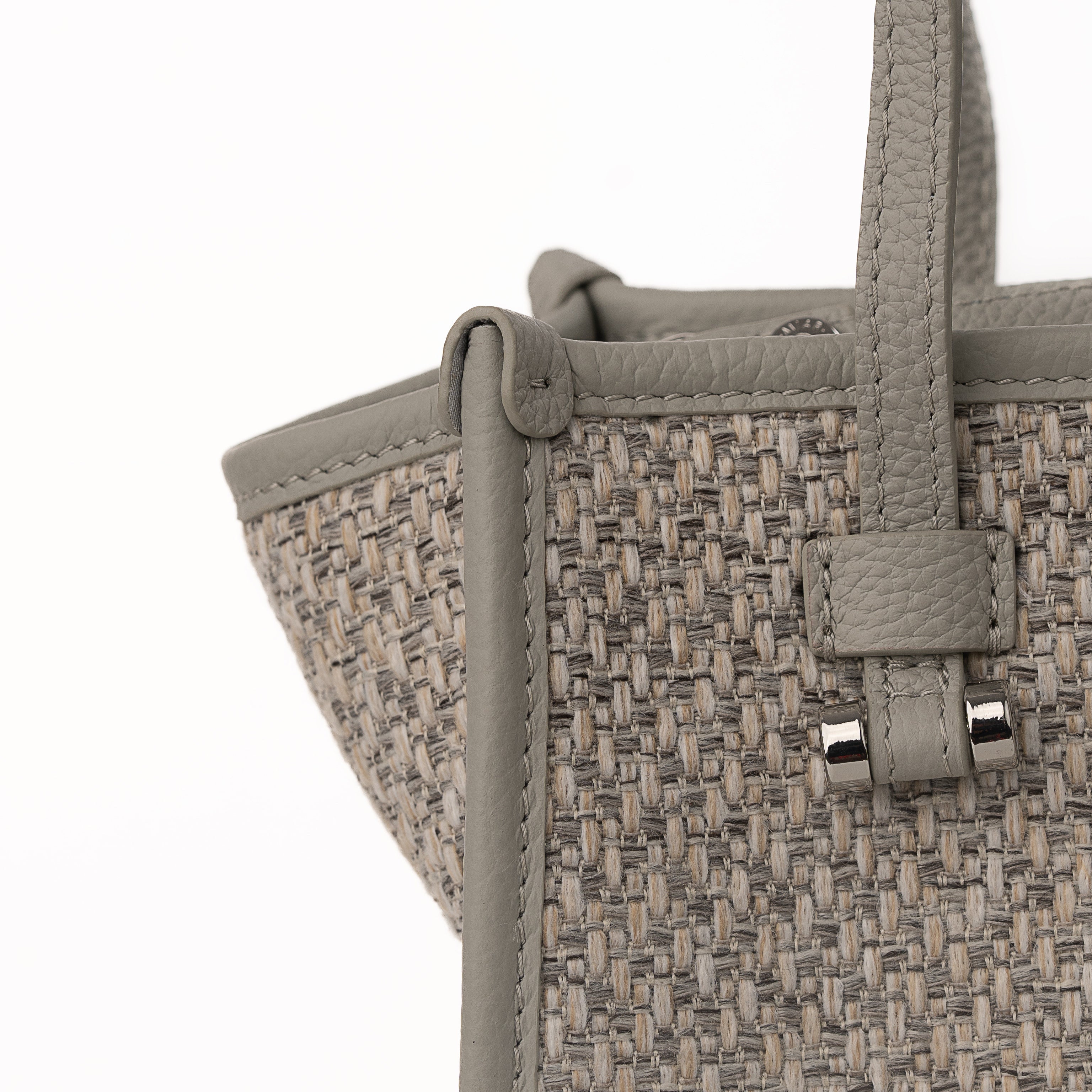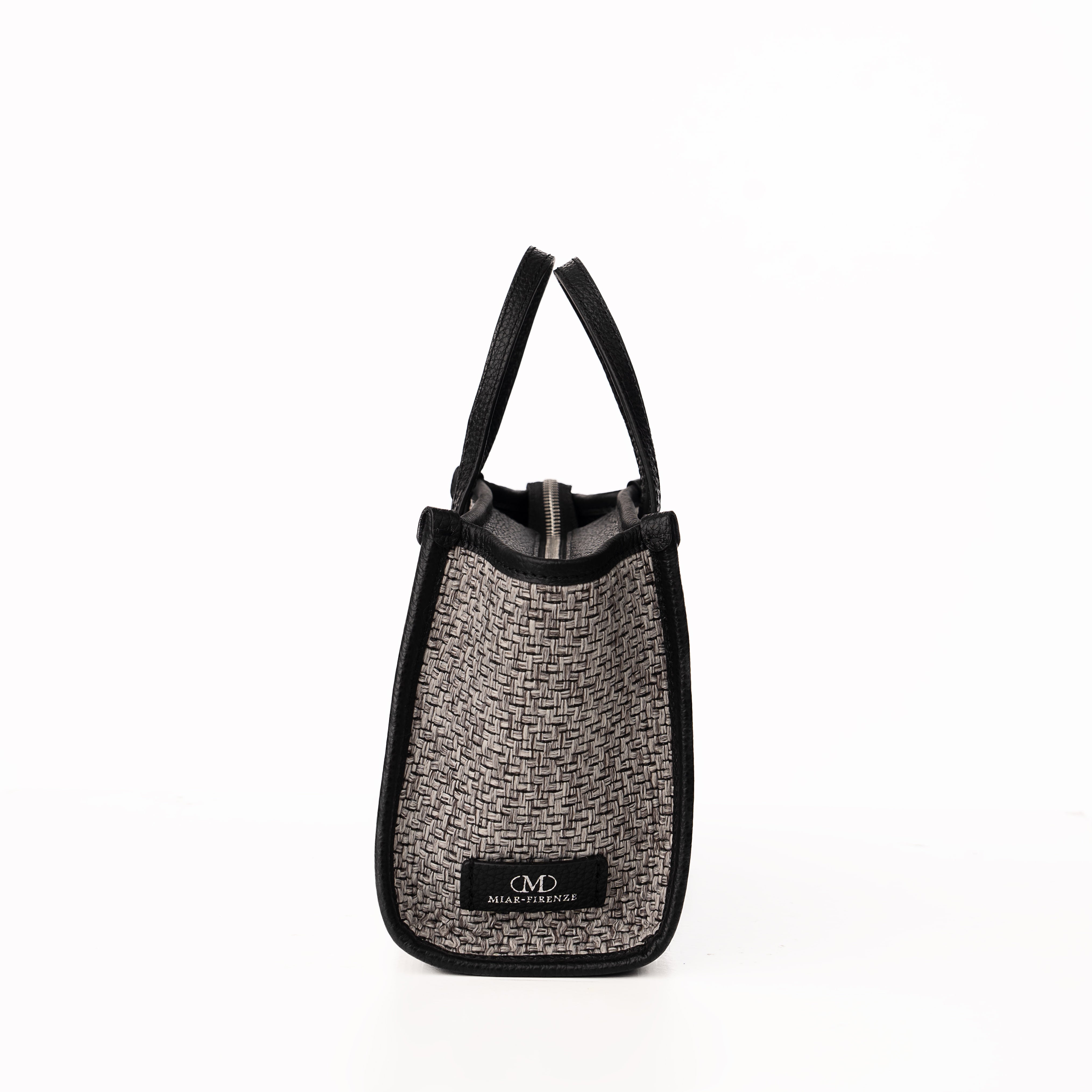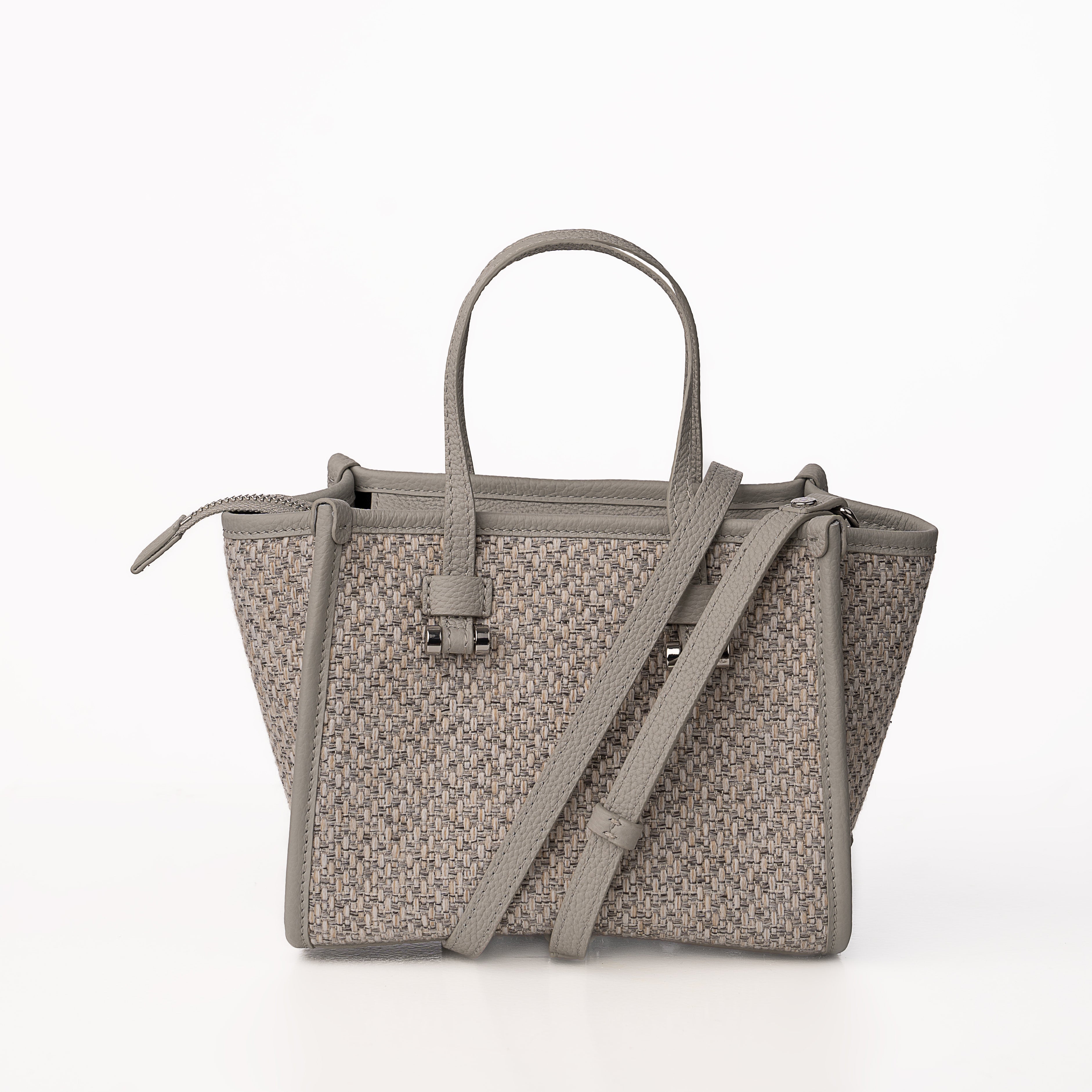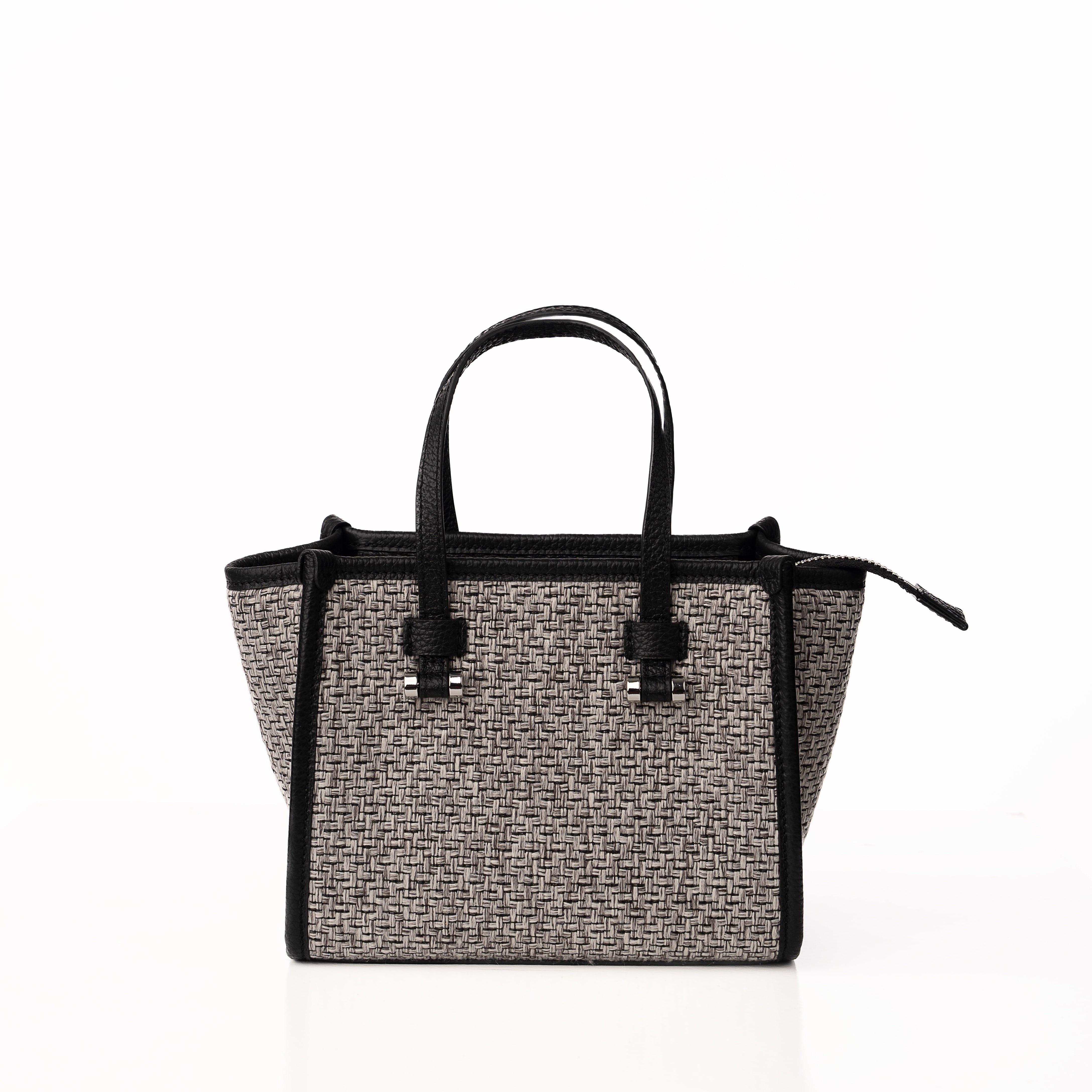 Blaire Mini Tote Bag is made with Weave fabric Material and Cow Leather with Black Twill fabric. This Bag can be wearable as a handbag or cross-body thanks to the thin detachable long strap. This bag is also available with 4 colors made with silver metal and zip closure with 3 cards slots