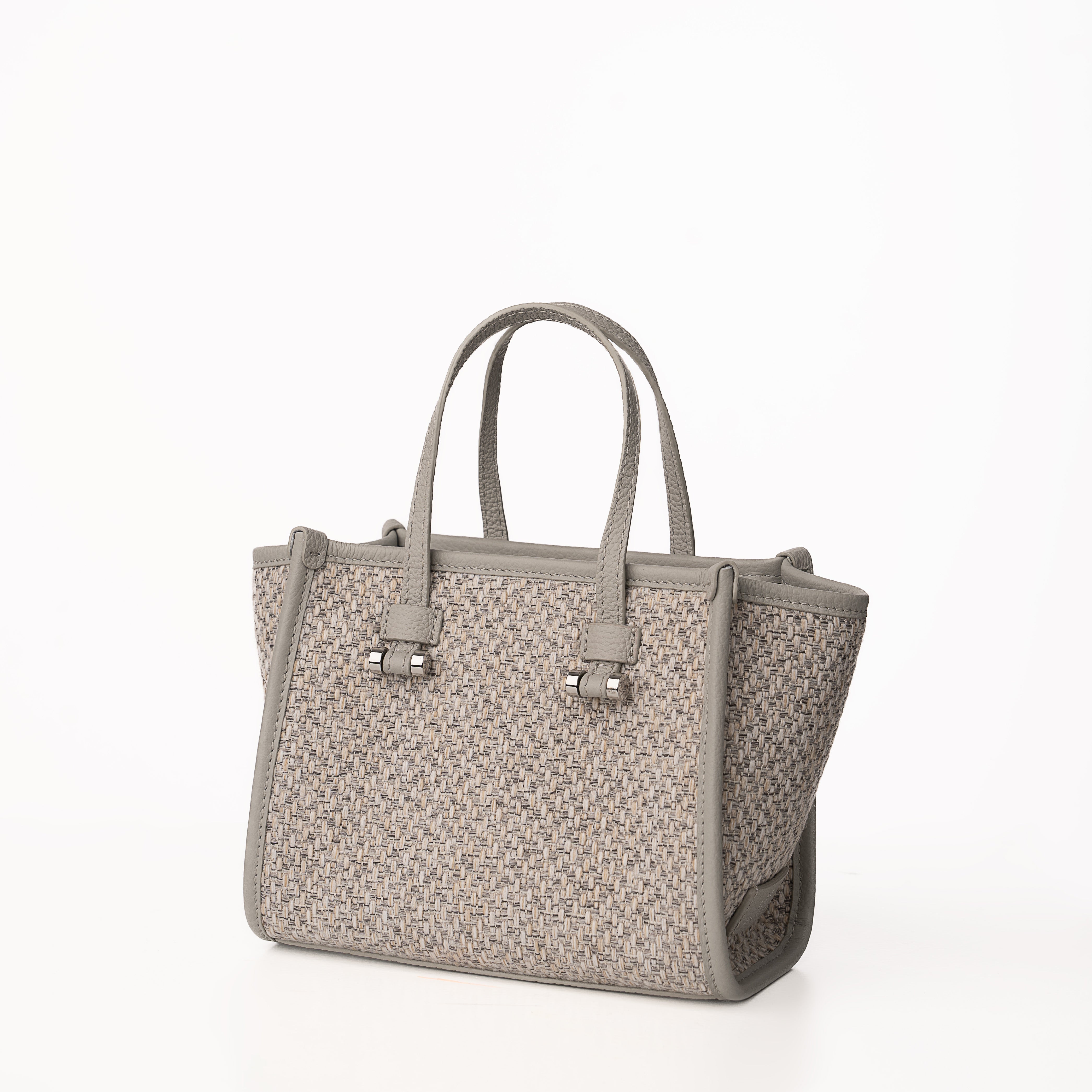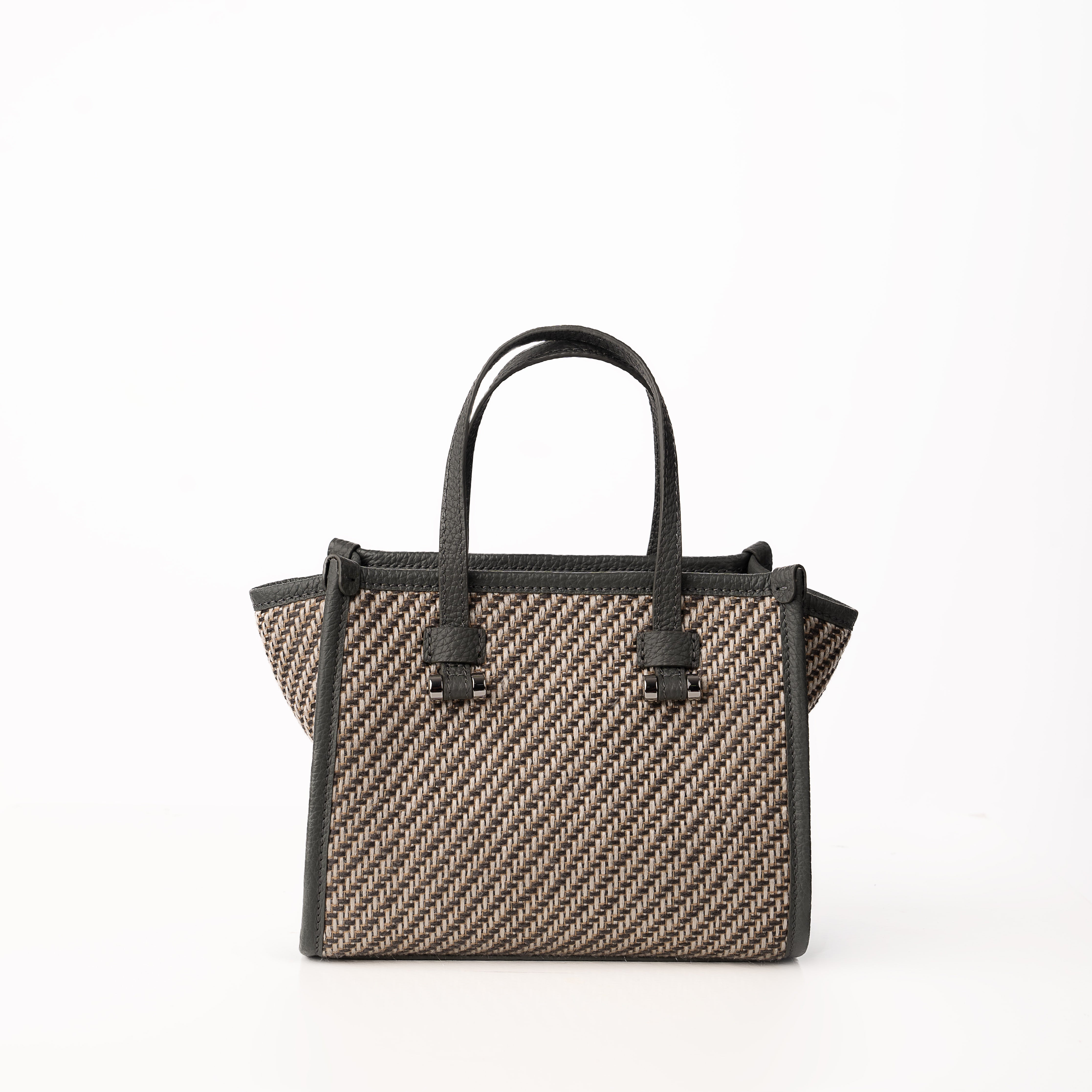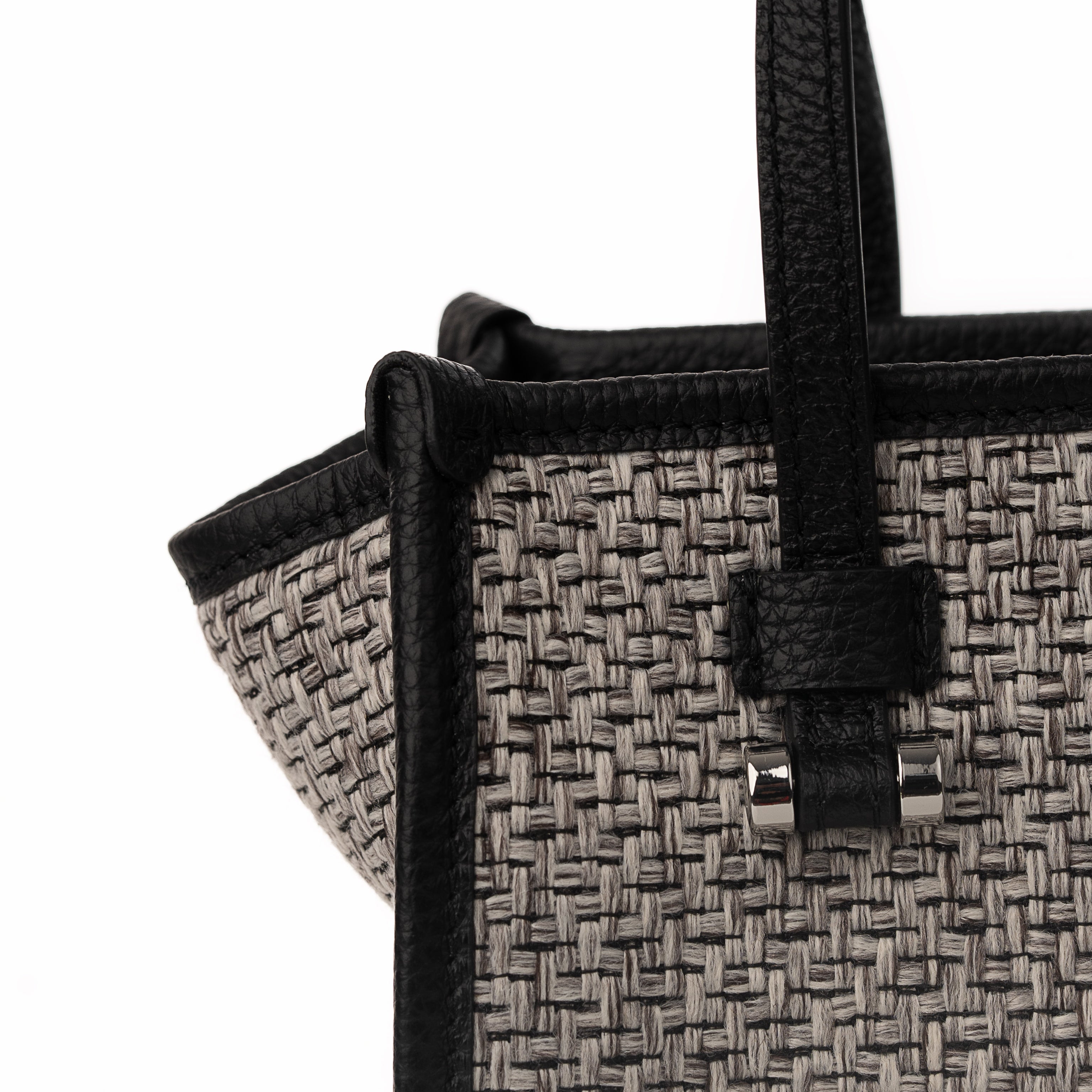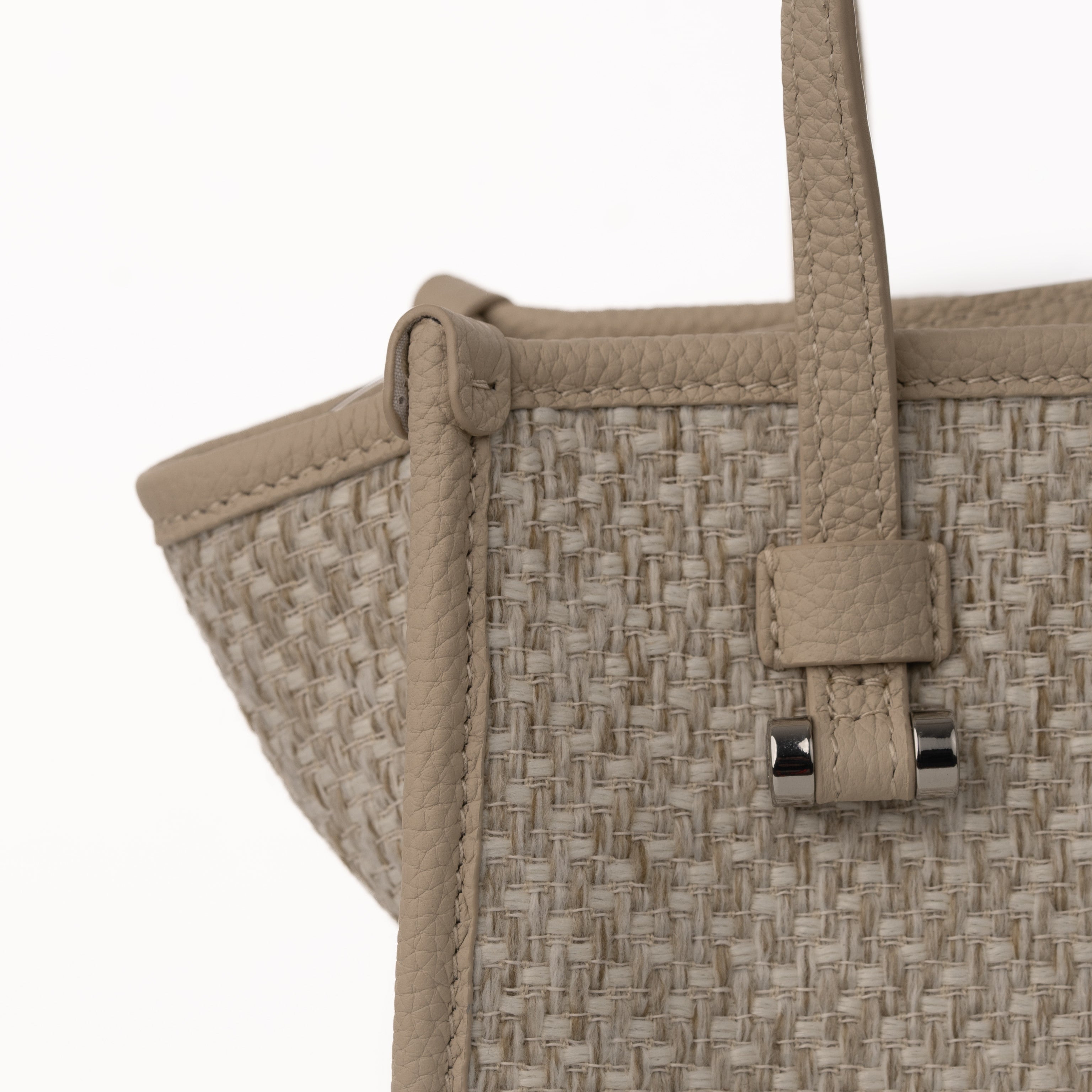 Blaire Mini Tote Bag is made with Weave fabric Material and Cow Leather with Black Twill fabric. This Bag can be wearable as a handbag or cross-body thanks to the thin detachable long strap. This bag is also available with 4 colors made with silver metal and zip closure with 3 cards slots