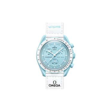 Harness the power of the sun with the Swatch x Omega Bioceramic Moonswatch Mission to theURANUS (SO33L100). The Swatch x Omega Mission to the URANUS (SO33L100) features a white velcro strap,  The watch also features orange sundial hands, tachymeter scale, and second hand, completing the sun-inspired look of the watch. The Swatch x Omega Mission to the Sun (SO33L100) is 3 bar water resistant, features quartz movement, and prominently showcases the Swatch and Omega logos on the dials.
